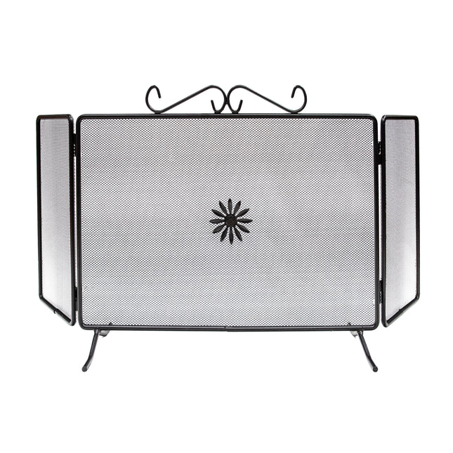 Pantalla Chimenea - Medidas abierto: 98,5 x 50 (Alt) cm.- Medidas cerrado: 61 x 50 (Alt.) cm.- Cuenta con 3 Paneles.- Rejilla de protección metalica pintada de color negro.- Estructura realizada en acero forjado, pintado de color negro.- Diseño con flor central en la rejilla y en la parte superior adorno de forja.- Articulo conocido como protectector chimenea, protector chispas chimenea, protector chimenea, protector rejilla chimenea, accesorios de chimenea, etc.
