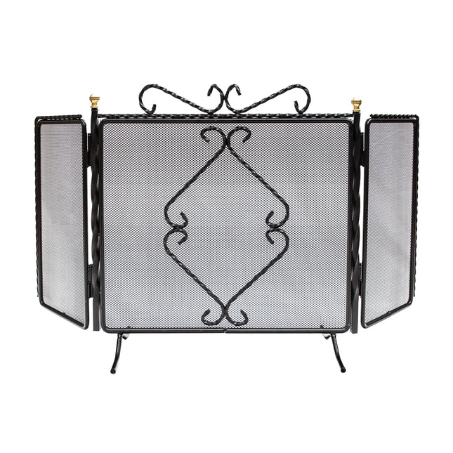 Pantalla Chimenea de la marca WOLFPACK LINEA PROFESIONAL. Medidas abierto: 94, 5 x 49, 5 (Alt) cm Medidas cerrado: 54 x 49, 5 (Alt. ) cm Cuenta con 3 Paneles Rejilla de protección metálica pintada de color negro Estructura realizado en acero forjado, pintado de color negro Diseño con adornos de forja en la rejilla y central con elemtos decorativos en dorado Artículo conocido como protectector chimenea, protector chispas chimenea, protector chimenea, protector rejilla chimenea, accesorios de chimenea, etc Más información y guía de uso: Kits de chimenea con atizador, pinzas y recogedor, además de protectores de chispa; mejoran seguridad y limpieza. Este producto pertenece a la categoría Accesorios para chimeneas de VicHome, donde encontrarás productos similares y sus variantes.