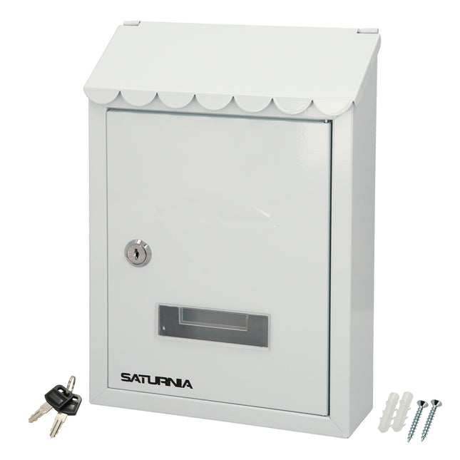 buzón exterior Country de la marca SATURNIA. Medidas (Largo / Alto / Fondo): 215 x 320 x 105 mm Realizado en acero pintado Color blanco Con visera Con cerradura y juego de llaves Con visor transparente