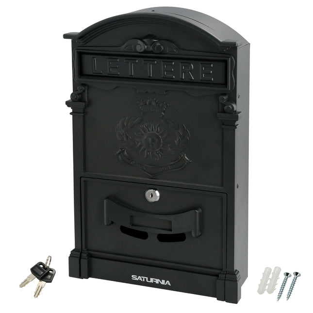 Buzón Jardín Aluminio Fundido Palace de la marca SATURNIA. Medidas(ancho x alto x fondo): 255 x 410 x 90 mm Realizado en aluminio fundido Color Gris Antracita Con cerradura y juego de llaves Con visor transparente
