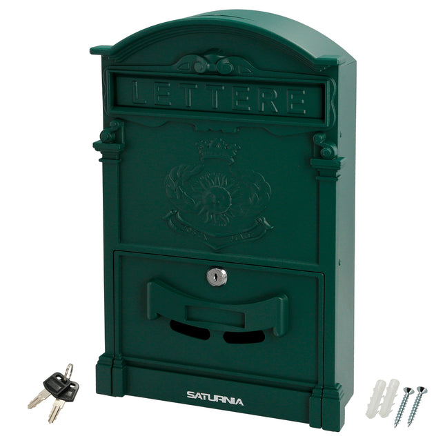 Buzón Jardín Aluminio Fundido Palace de la marca SATURNIA. Medidas(ancho x alto x fondo): 255 x 410 x 90 mm Realizado en aluminio fundido Color verde Con cerradura y juego de llaves Con visor transparente