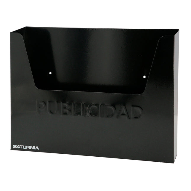 Cesta publicidad de la marca SATURNIA. Medidas: 355 x 50 x 255 (Alt) mm Realizado en metal Color antracita Artiuclo conocido como cesta propaganda, buzón propaganda, buzón publicidad