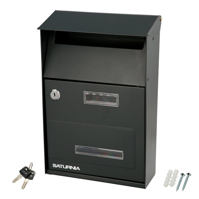 buzón exterior Country de la marca SATURNIA. Medidas (Largo / Alto / Fondo): 215 x 320 x 105 mm Realizado en acero pintado Color gris oscuro Con visera Con cerradura y juego de llaves Con visor transparente