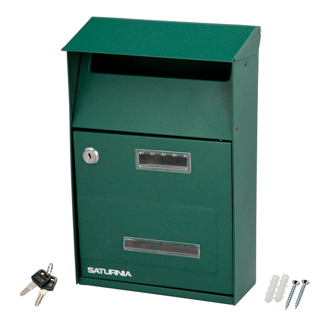 buzón exterior Country de la marca SATURNIA. Medidas (Largo / Alto / Fondo): 215 x 320 x 105 mm Realizado en acero pintado Color verde Con visera Con cerradura y juego de llaves Con visor transparente