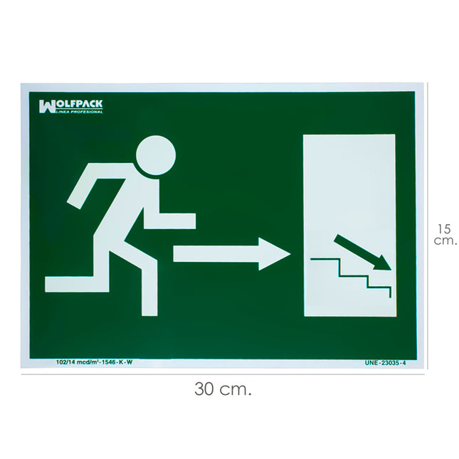 WOLFPACK LINEA PROFESIONAL Cartel / Señal Fluorescente / Señal Fluorescente Salida Escalera Derecha Abajo 21x30 cm.