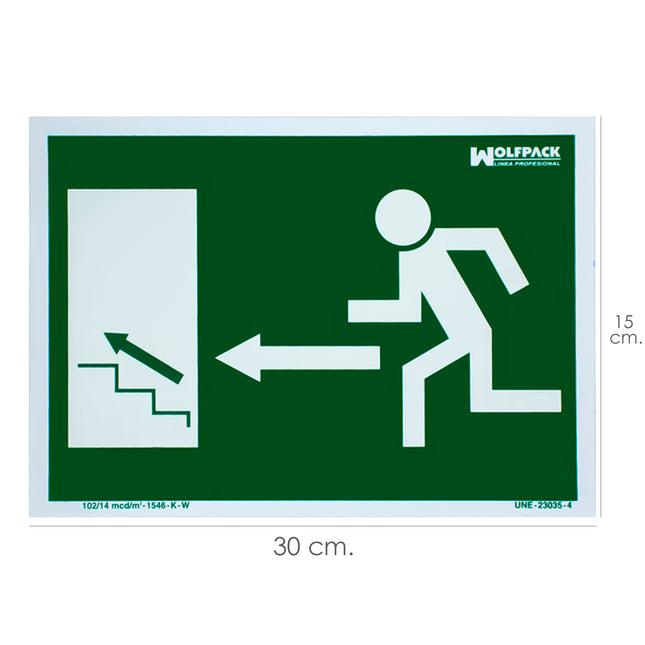 WOLFPACK LINEA PROFESIONAL Cartel / Señal Fluorescente Salida Escalera Izquierda Arriba 21x30 cm.