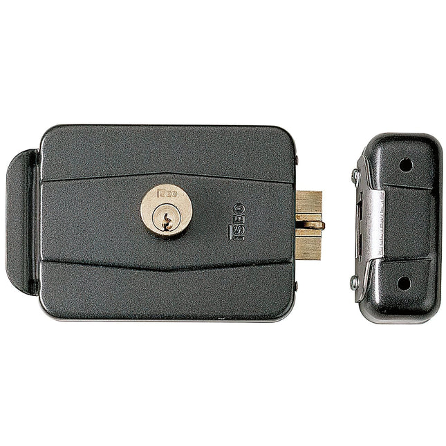 Cerradura Jis electromecanica 1902/Izquierda de la marca JIS. Cerradura eléctrica de sobreponer Cilindro exterior e interior. Entrada 50-80 mm. Visera Medidas: ancho 127 mm. x alto 105 mm Abertura a izquierdas 12 V. /AC: 3 A