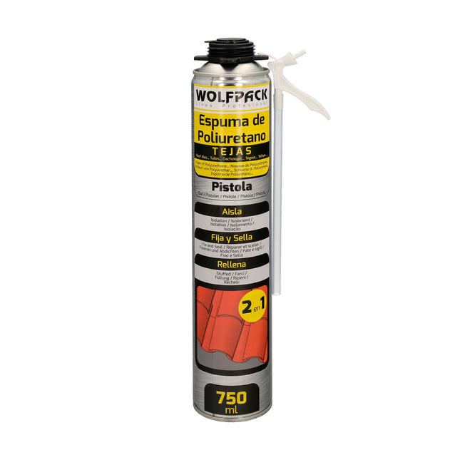 Espuma poliuretano 750 ml. tejas para pistola de la marca WOLFPACK LINEA PROFESIONAL. Capacidad: 750 ml Para pistola La espuma de poliuretano combina propiedades de fácil adhesión, fijación, sellado, relleno e impermeabilidad con gran capacidad de aislamiento térmico, acústico y eléctrico Debido a su alto poder expansivo y a la gran compatibilidad de todas sus propiedades con la gran mayoría de materiales utilizados en la construcción, se convierte en el producto ideal para proteger y aislar instalaciones de ventilación y climatización, relleno de cámaras de aire, cerramientos, pasatubos, huecos en cascos de barcos, fijación de paneles ligeros, cercos, marcos de puertas y ventanas, etc. Absorbe vibraciones y movimientos entre materiales y en el proceso de expansión, su volumen final puede ser hasta 4 - 5 veces superior al volumen inicial, una vez endurecido resiste al agua y a productos químicos en general y una vez secado se puede cortar, lijar, pulir, pintar. Más información y guía de uso: Masillas elásticas (PU/MS) para pegar y sellar con alta adherencia incluso en húmedo; pintables y sin disolventes agresivos. Este producto pertenece a la categoría Masillas de poliuretano de VicHome, donde encontrarás productos similares y sus variantes.