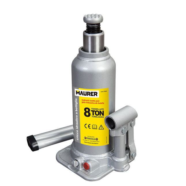 Gato Hidraulico Maurer Botella 8000 Kg. - Elevación máxima de peso: 8.000 kg.- Altura mínima / máxima: 230 / 457 mm. - Base estable.