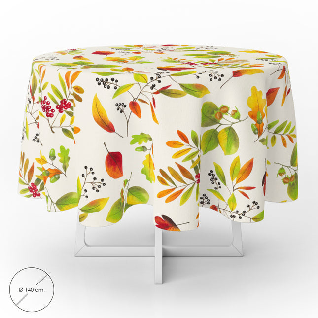 Mantel Hule Redondo Ø 140 cm. Hojas Otoño- Medidas: Diámetro de Ø 140 cm. - Mantel Hule estampado en color blanco con formas de hojas y pequeñas ramas en varios tonos verdes y cálidos. Diseño moderno y elegante para cualquier ocasión. - Protege la mesa de salpicaduras, derrames, arañazos y antimanchas. - Es impermeable y antideslizante. - Resistente y duradero, adecuado tanto para exteriores como interiores. - Fabricado en PVC y con revestimiento de fieltro suave en la parte trasera. - Puede limpiarse fácilmente con un paño húmedo. - No apto para uso en lavadora, secadora o plancha. - Ideal para mesas de salón, cocina, comedor, terraza o jardín. - Perfecto para proteger muebles, mesas o superficies, tanto dentro como fuera de casa. - Para reducir las arrugas del mantel, con un secador de mano aplicar calor con una separación de 15 cm. durante 20 segundos.- Articulo también conocido como Hule, hules antimanchas, hule anti manchas,mantel antimanchas, mantel anti manchas, mantel cocina, mantel protector, cobertor mesas, cubremesas, hule cocina, etc.