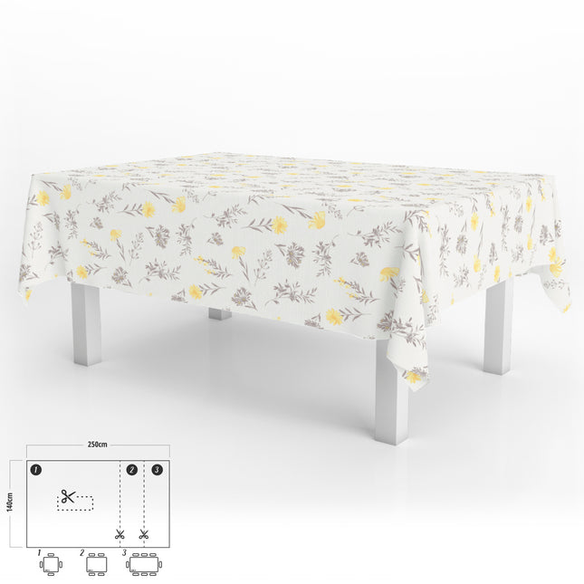 Mantel Hule Rectangular 140 x 250 cm. Flores Amarillas- Medidas: 140 x 250cm. - Mantel Hule estampado en color gris con formas de flores amarillas. Diseño moderno y elegante para cualquier ocasión. - Se puede cortar o ajustar fácilmente a cualquier medida, para adaptarlo a cualquier tipo de mesa, superficie o manualidad. - Protege la mesa de salpicaduras, derrames, arañazos y antimanchas. - Es impermeable y antideslizante. - Resistente y duradero, adecuado tanto para exteriores como interiores. - Fabricado en PVC y con revestimiento de fieltro suave en la parte trasera. - Puede limpiarse fácilmente con un paño húmedo. - No apto para uso en lavadora, secadora o plancha. - Ideal para mesas de salón, cocina, comedor, terraza o jardín. - Perfecto para proteger muebles, mesas o superficies, tanto dentro como fuera de casa. - Para reducir las arrugas del mantel, con un secador de mano aplicar calor con una separación de 15 cm. durante 20 segundos.- Articulo también conocido como Hule, hules antimanchas, hule anti manchas,mantel antimanchas, mantel anti manchas, mantel cocina, mantel protector, cobertor mesas, cubremesas, hule cocina, etc.