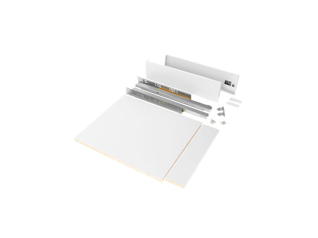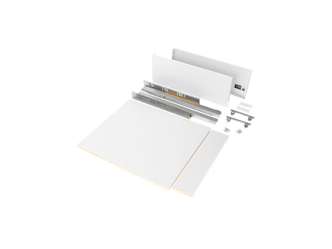 Drawer kit for kitchen and bathroom with all the necessary elements for its assembly. It is the optimal solution for the furniture in your kitchen, bathroom or closet with a Elegant design in anthracite grey and white . Each kit consists of all the elements necessary for the assembly of an external drawer of height 93 mm and depth 500 mm with various module widths . Includes: two side panels, a set of soft-closing guides, a set of decorative covers, back and bottom panels and fixings for the drawer front. All you need is the front panel with the required drawer dimensions. The metal side ribs are made of steel with Anthracite grey and white painted finish, allow for adjustment of the drawer front ±2mm vertically and ±1mm horizontally . The guides are Full extension with soft closing and allow a maximum load of 40 kg for the drawer. The The included back and bottom panels are made of particle board in anthracite grey and white and with a rough surface to give greater surface resistance. The boards are made of thickness 16 mm and are cut to size standard modules (450 mm, 600 mm and 900 mm) . However, can be cut to adapt to the module width needed. Kit of hardware required for the assembly of a drawer with a height of 93 mm and a depth of 500 mm, except for the drawer front, in modules with a width of 450 mm and a side thickness of 16 mm. Synchronized full-extension guides, with cushioned closing and load capacity of 40 kg. Possibility of cutting the boards to adjust the width of the drawer to the desired measurement. Drawer front position adjustment: ±2 mm vertically and ±1 mm horizontally. Made of white painted steel and chipboard with melamine of the same colour. FAQs - Frequently Asked Questions: Can Vertex drawer kits be adapted to other module widths? Yes, for example, if we want to assemble a drawer for a 500 mm wide module, we must start from the existing code for a 600 mm module and cut the bottom and back boards to width according to the formula: Internal width of module – 19 mm. What thickness of the module side are the boards included in the Vertex kit designed for? They are calculated for a side thickness of 16 mm. How thick are the boards included in the Vertex kit? Both the bottom and the back have a thickness of 16 mm.