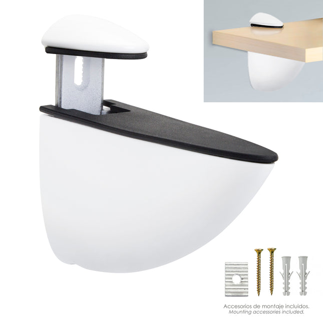 Adjustable Pelican Shelf Support - Measurement: 40 x 70 (H) mm. - Adjustable from 1 to 20 mm. - White finish. - Made of metal. - Includes all mounting accessories. - Article also known as a butterfly, shelf support, pelican shelf bracket, shelf angle.