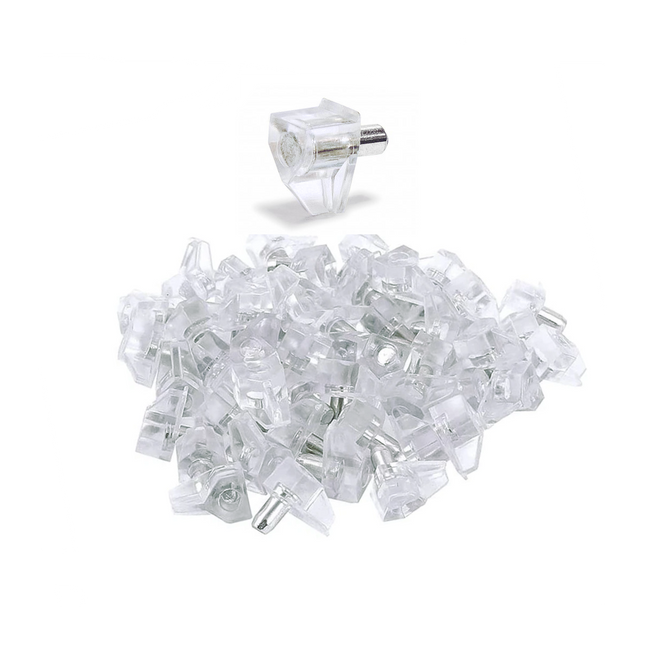 Support for wooden shelves made of plastic with a turned steel pin. The outer plastic support measures 10.4 mm wide and 16.2 mm high. For installation, it requires a 8.5 mm deep hole with a thread corresponding to the diameter of the pin. It is available in a presentation with a 5 mm diameter pin. The plastic is transparent and the packaging contains 1000 units. For the 5 mm diameter pin version, a transparent or black finish is available and the packaging can be made in 1000 or 100 units.