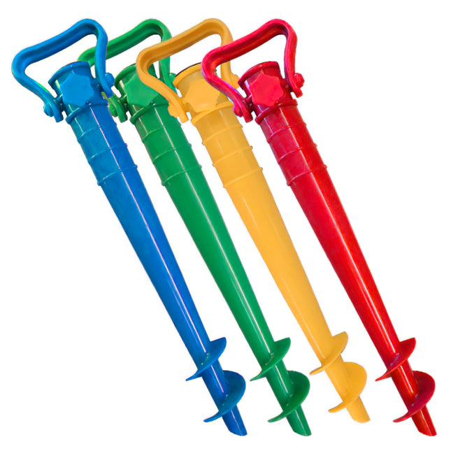 Umbrella spike - Made of ABS plastic. - Assorted colors. - Built-in handle makes it easy to put into the sand. - Weight: 200 grams.