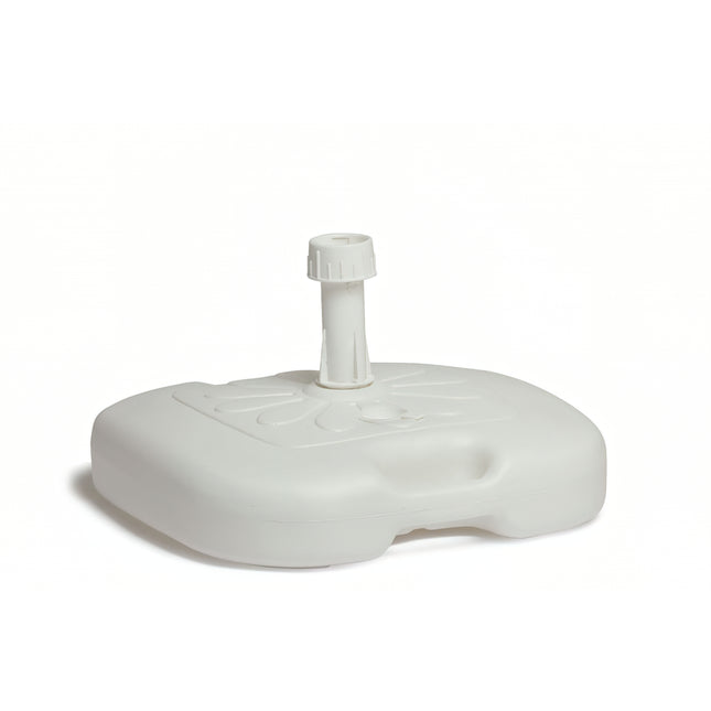 White ABS umbrella base. - Capacity: 20 liters. - White color. - With handle for easy transport. - Can be filled with water or sand. - Weight 850 grams.