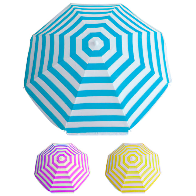 Beach umbrella aluminium polyester 200 cm stripes - Measurement: 200 cm in diameter. - Assorted colors. - Made of aluminum. - Outer/inner tube: 32/28 Ø mm. - Made of polyester. (180 gr/m2) - With tilt system. - Weight: 1.9 Kg.