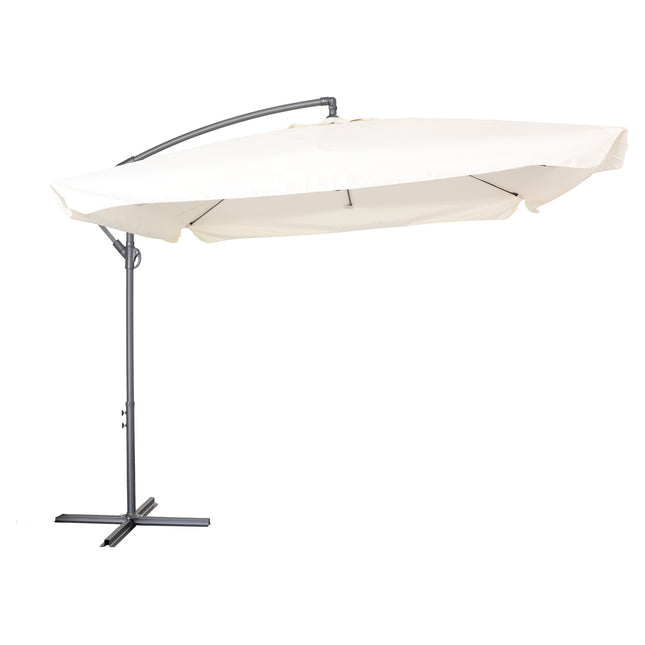 Garden umbrella with side stand - Square umbrella - Measures 250 x 250 x 230 - Epoxy painted aluminium/steel structure, dark grey colour. - 180 gr/m2 beige polyester cover. Water repellent. - With parasol. - Crank to easily fold and unfold the umbrella. - Steel ribbed base 77 x 75 cm. - Mast Ø 48 mm - Aluminium suspension pole Ø 42 mm. The base must be completed with 4 plates of at least 50x50 cm and a total weight of 90kg. Plates not included. - 8 metal antlers 12 x 18 mm. - The fabric provides UV protection. - The height and inclination of the umbrella can be adjusted. - Anti-return crank that facilitates the opening and closing of the umbrella. - Valid replacement fabric 08091162 Replacement Fabric Parasol Side Foot Square 2.5 x 2.5 Meters - Item also known as side terrace umbrella, garden pedestal umbrella, garden umbrella, patio umbrella, terrace umbrella, umbrella with crank, tilting umbrella, etc.