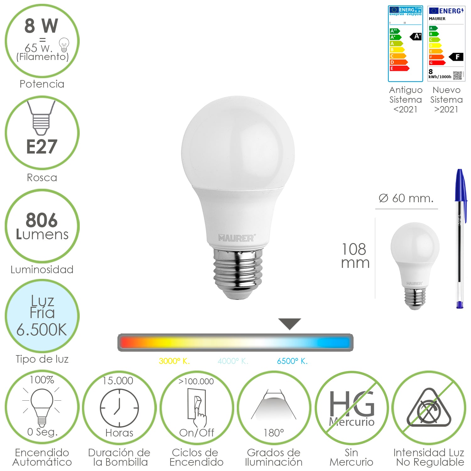 Standard LED Bulb E27 Screw. 8 Watt. Equivalent to 65 Watt. 806 Lumens. Cold Light (6500º K.)