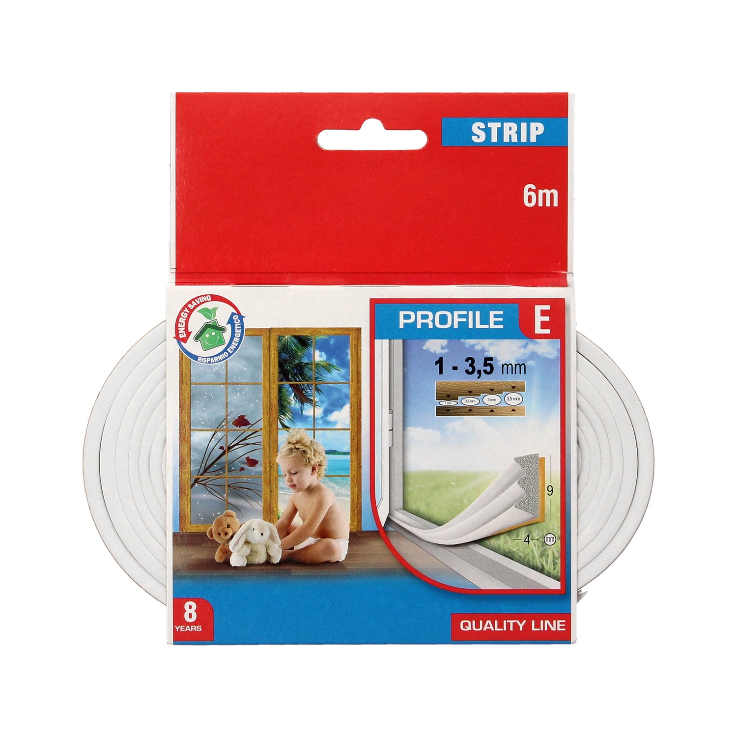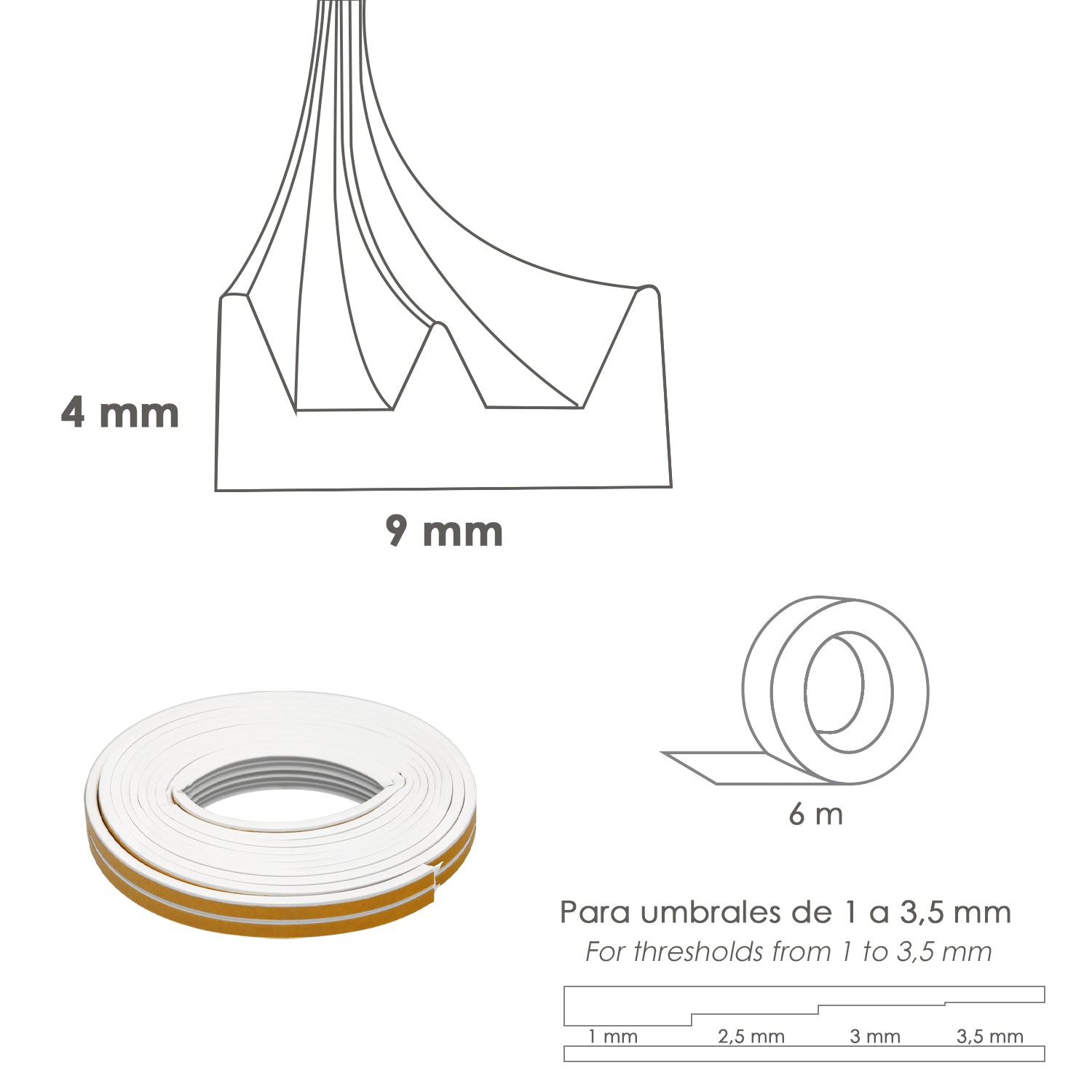 White Rubber Weatherstrip Roll 6 Meters x 9 mm. Window and Door Sealant. Noise Insulation. For Thresholds from 1 to 3.5 mm.