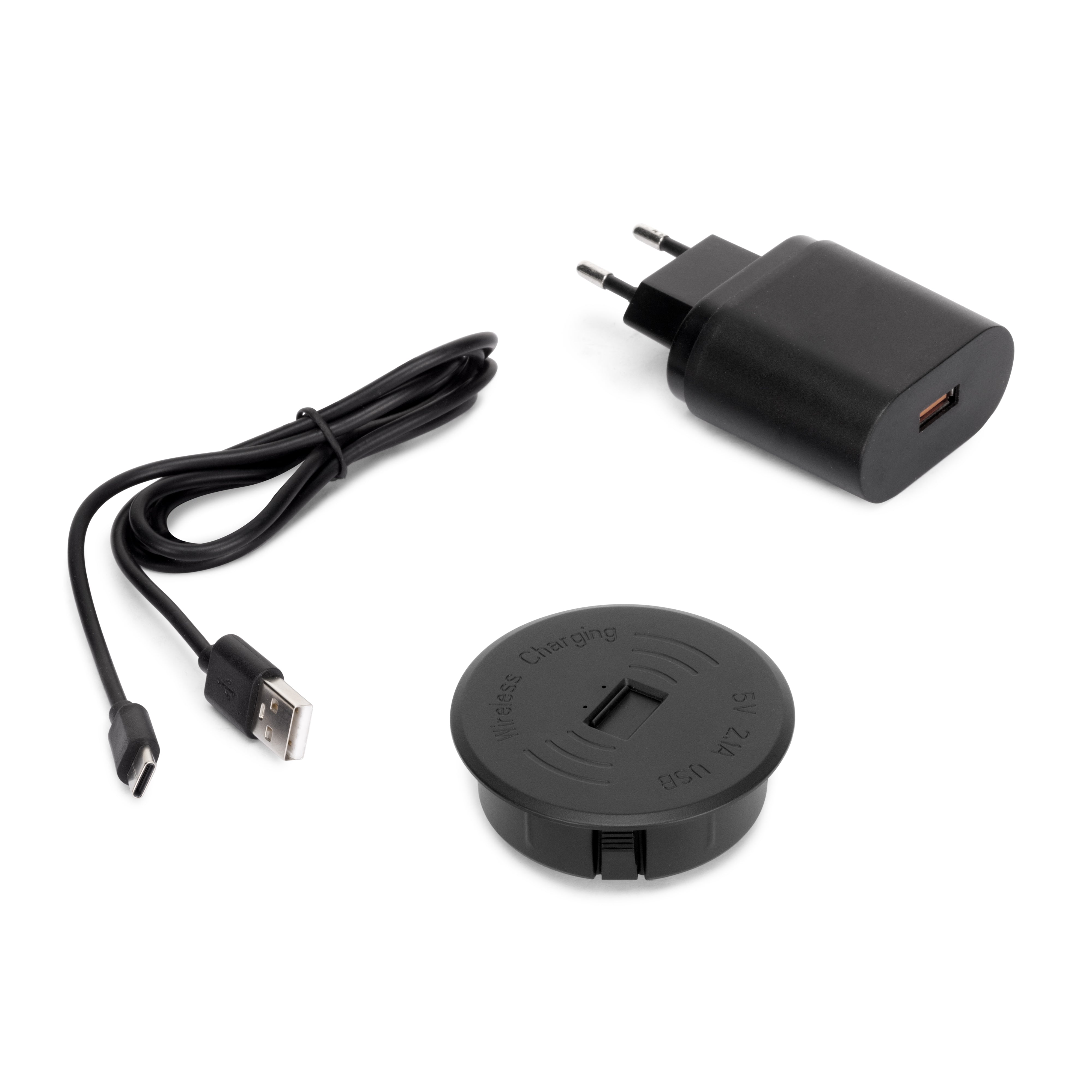 Emuca Airtop 2 Surface Wireless Charger for Mobile Phones with USB A, D.60mm, 5V DC / 2.1A (USB-10W/Qi-10W), Plastic, Black