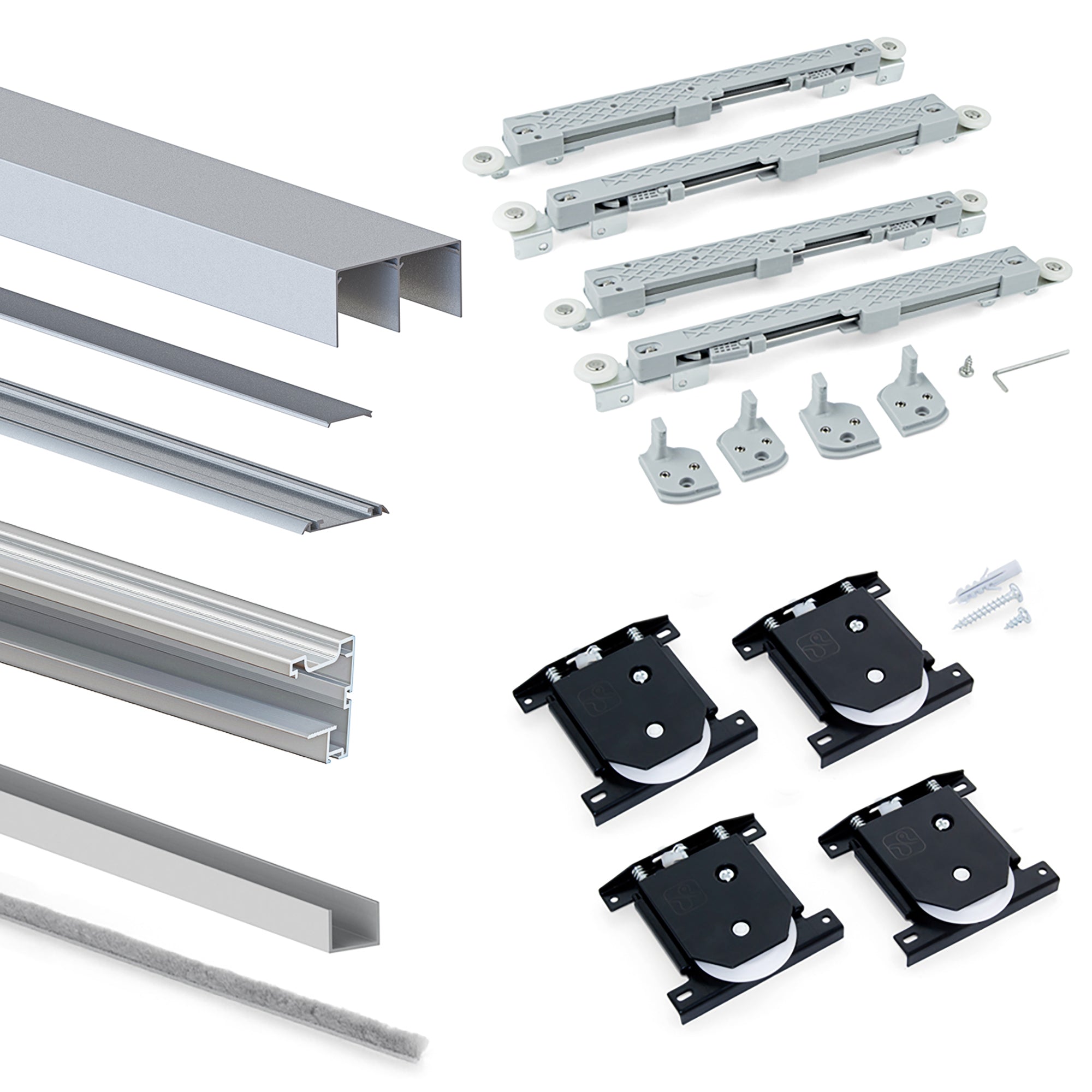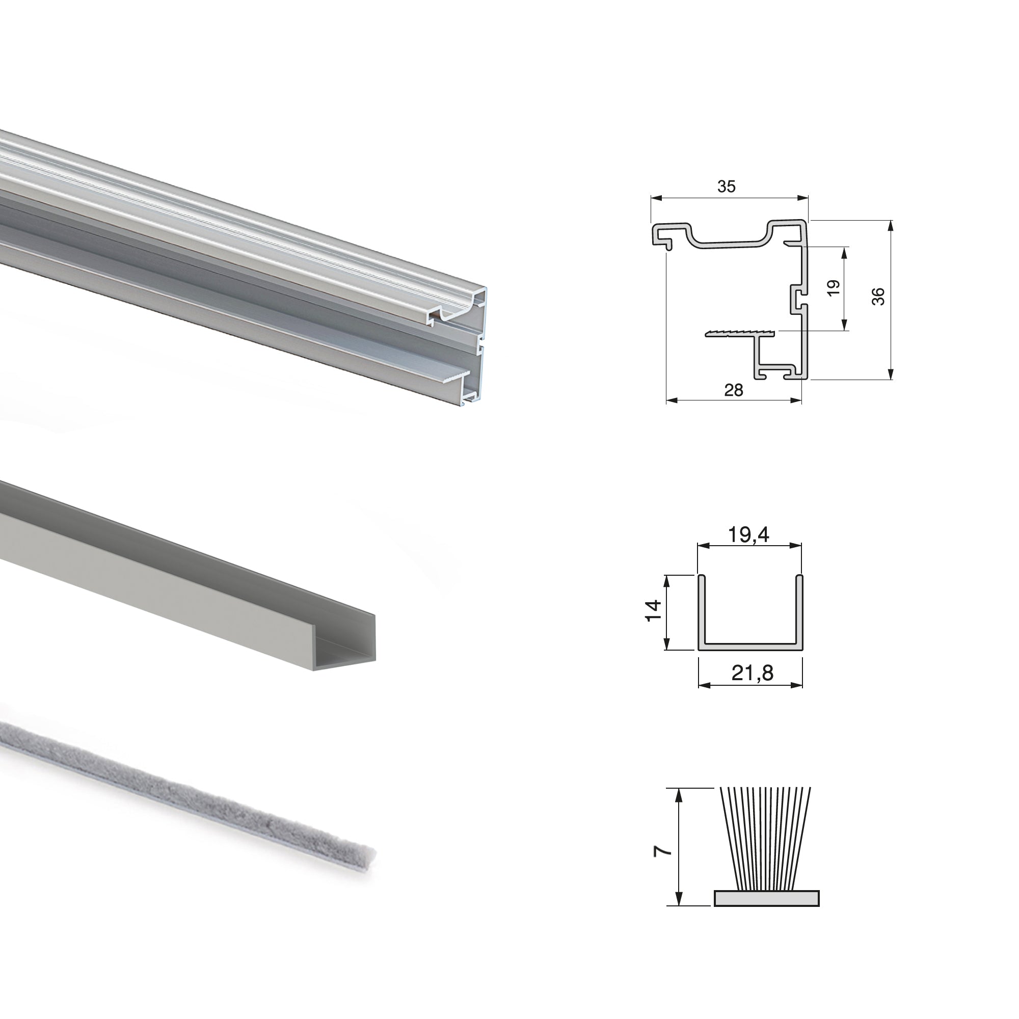 • Thickness 19 - 20 mm 1 set of fittings for two doors, 1 set of soft-closing devices, 1 upper rail of 2.35m, 1 lower rail of 2.35m, 1 lower rail cover of 2.35m, 4 handle profiles of 2.35m, 1 U-shaped crossbar profile of 2.35m