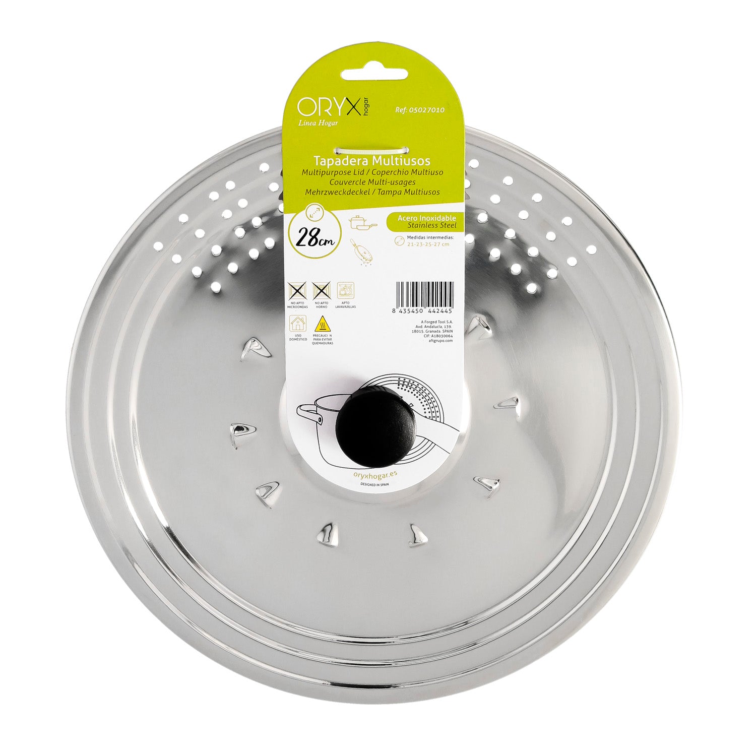 Multipurpose Stainless Steel Lid Ø 28 cm. Use as Anti-Splash Lid and Drainer. Lid Adaptable to Different Sizes