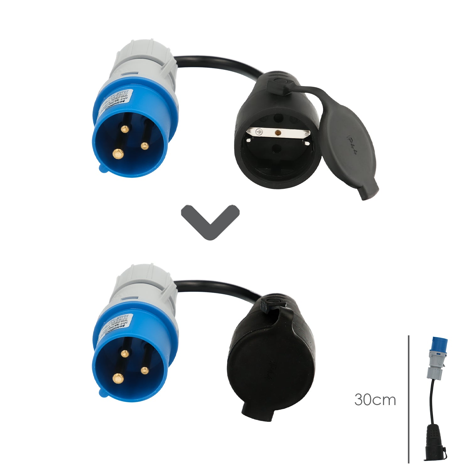 Adaptador de clavija CEE a Schuko, 2 polos + Tierra. Max. 16A. 230V