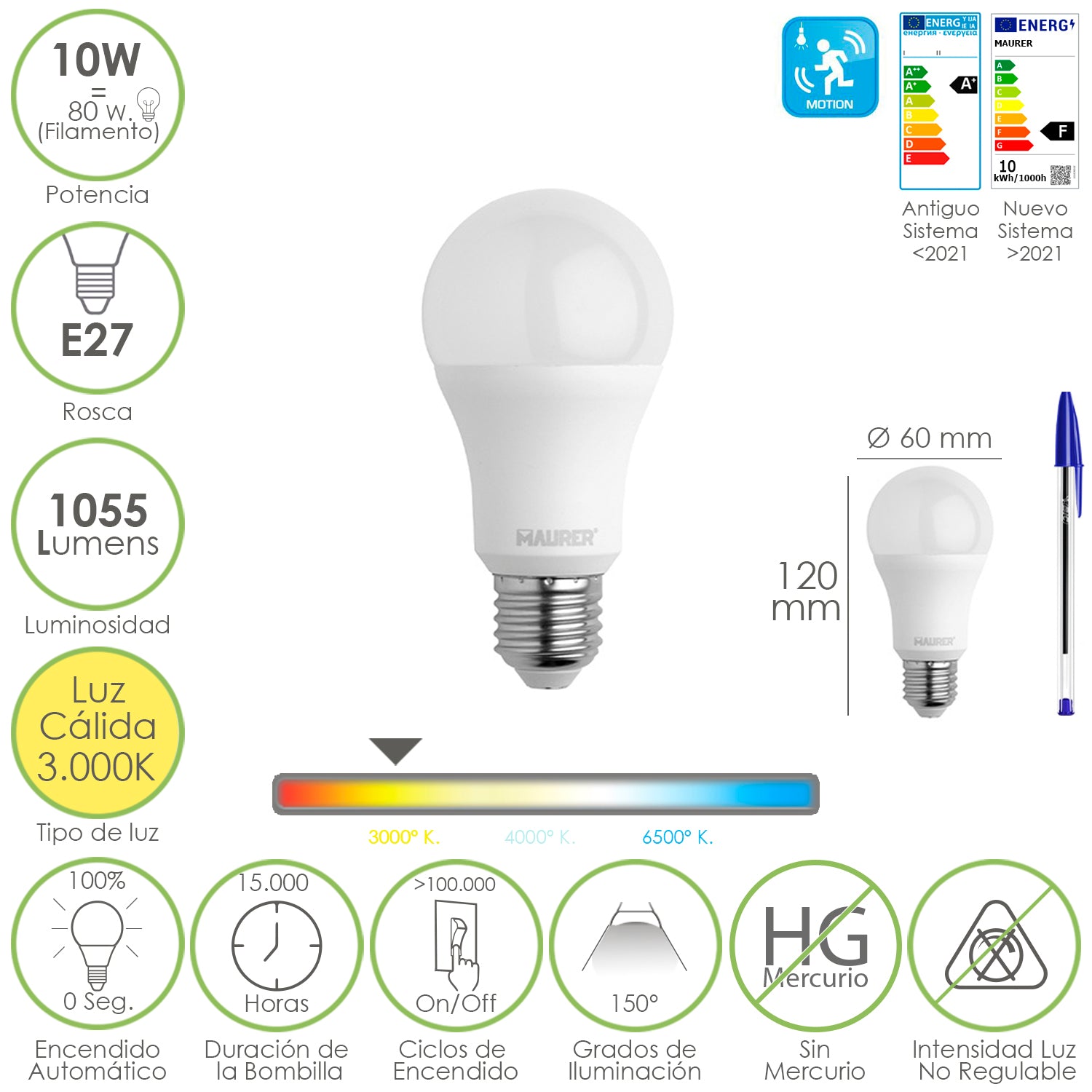 Bombilla Led Esfera Con Sensor Movimiento Rosca E27. 10 Watt. Equivale A 80 Watt. 1055 Lumenes. Luz Calida 3000º K.