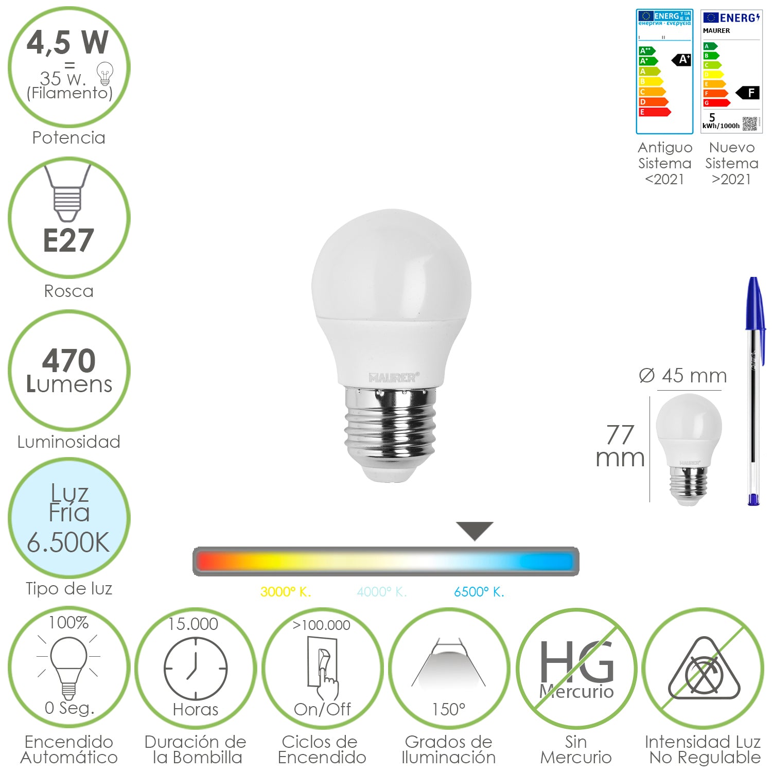 Bombilla Led Esferica Rosca E27 4.5 Watt. Equivale A 55 Watt. 470 Lumenes. Luz Fria (6500º K)