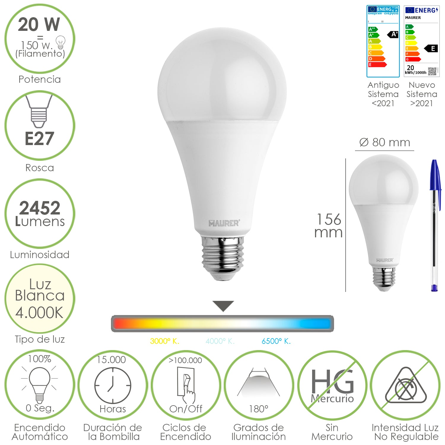 Bombilla Led Estandar Rosca E27. 20 Watt. Equivale A 150 Watt. 2452 Lumenes. Luz Neutra (4000º K.)