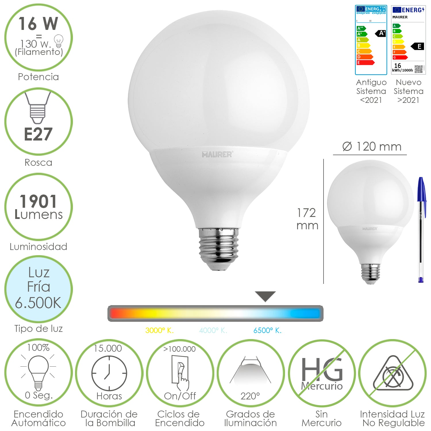Bombilla Led Globo Rosca E27. 16 Watt. Equivale A 130 Watt. 1901 Lumenes. Luz Fria 6500º K.