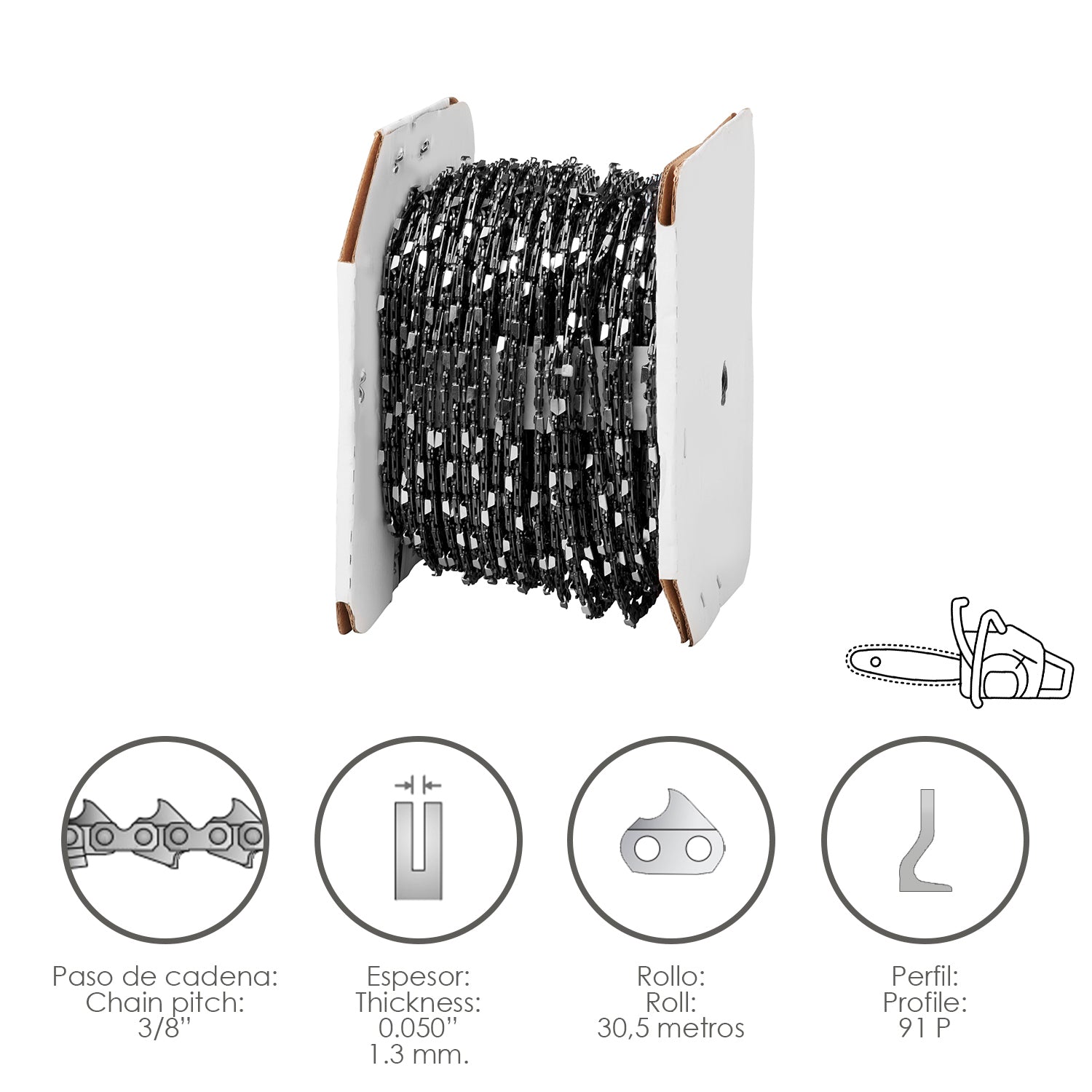 Cadena Motosierra 3/8" / 0.050" 1,3 mm. / 91 P / Rollo 30,5 metros.