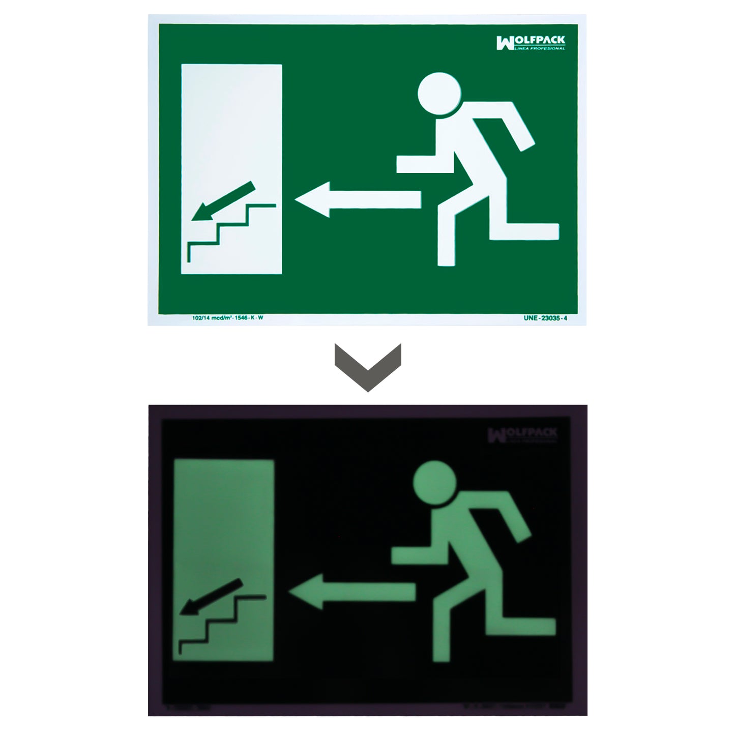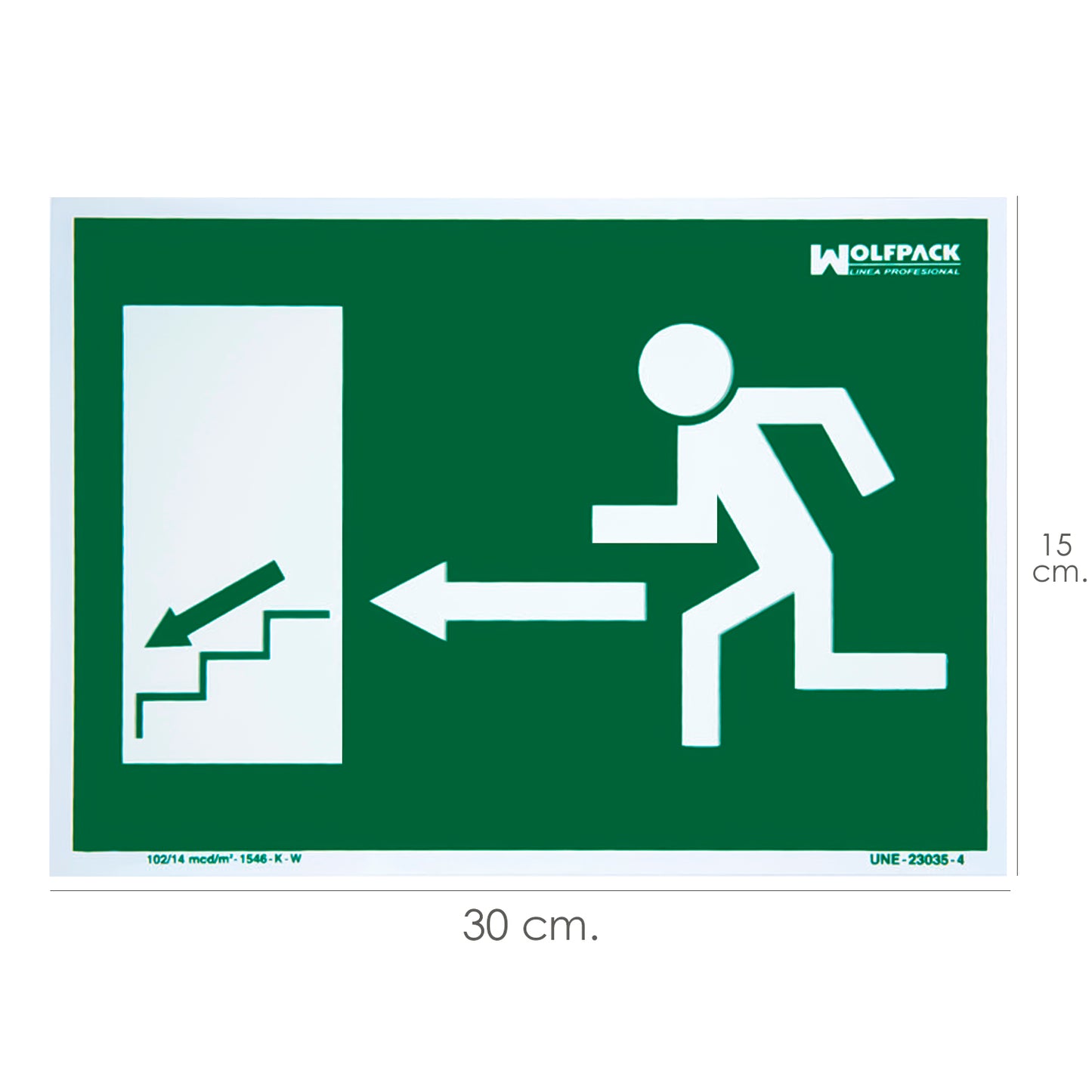 Cartel / Señal Fluorescente Salida Escalera Izquierda Abajo 21x30 cm.