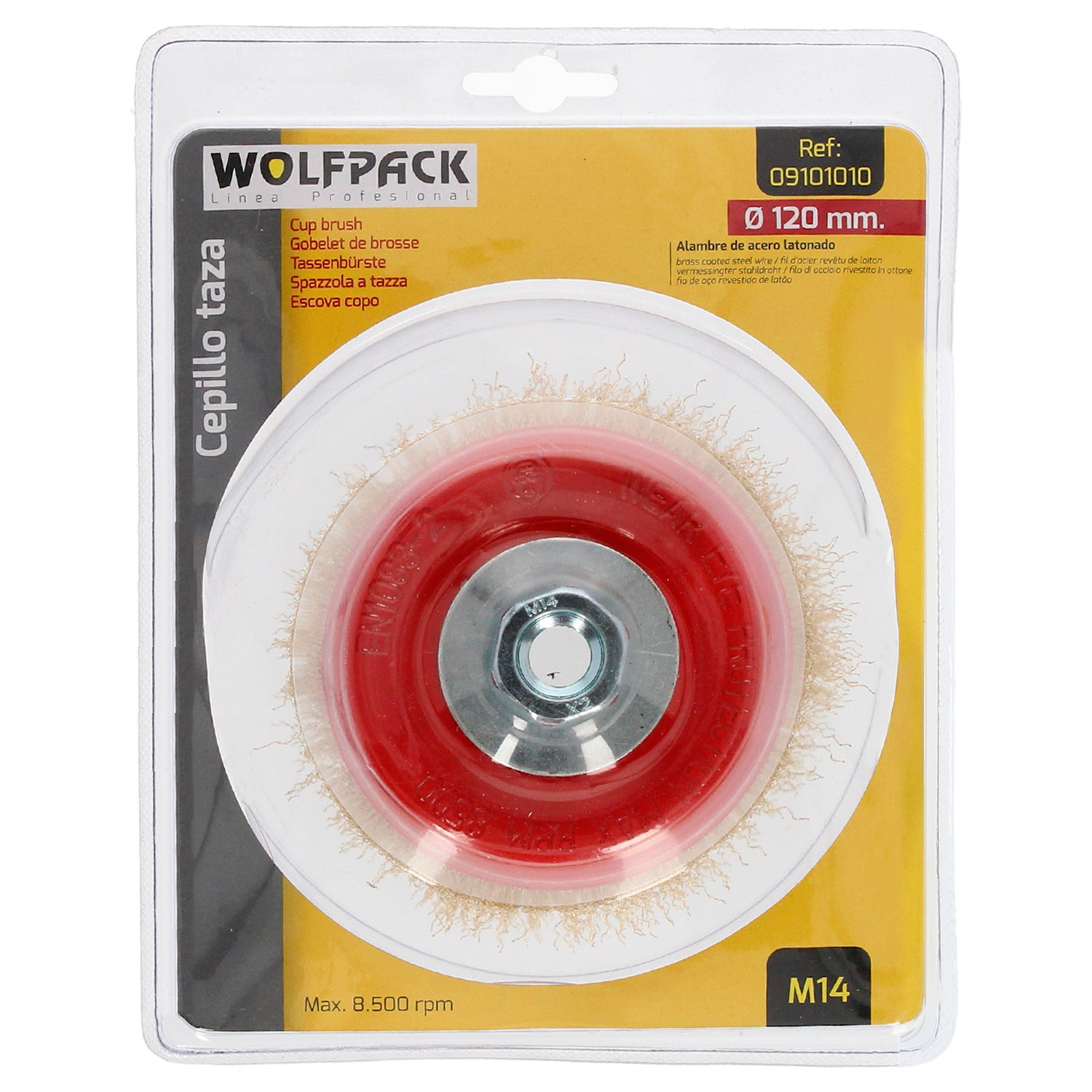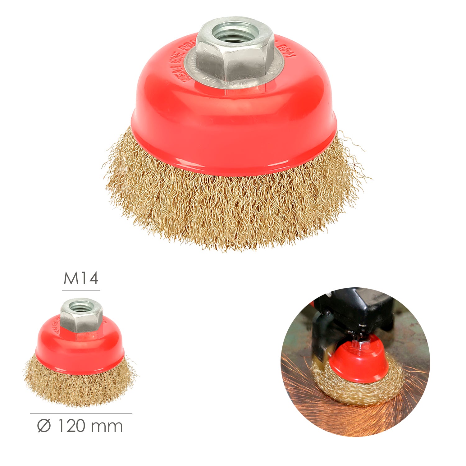 Cepillo Taza Con Alambre De Acero Latonado Rosca M14, Ø 120 mm. Alambre de Ø 0,30 mm.