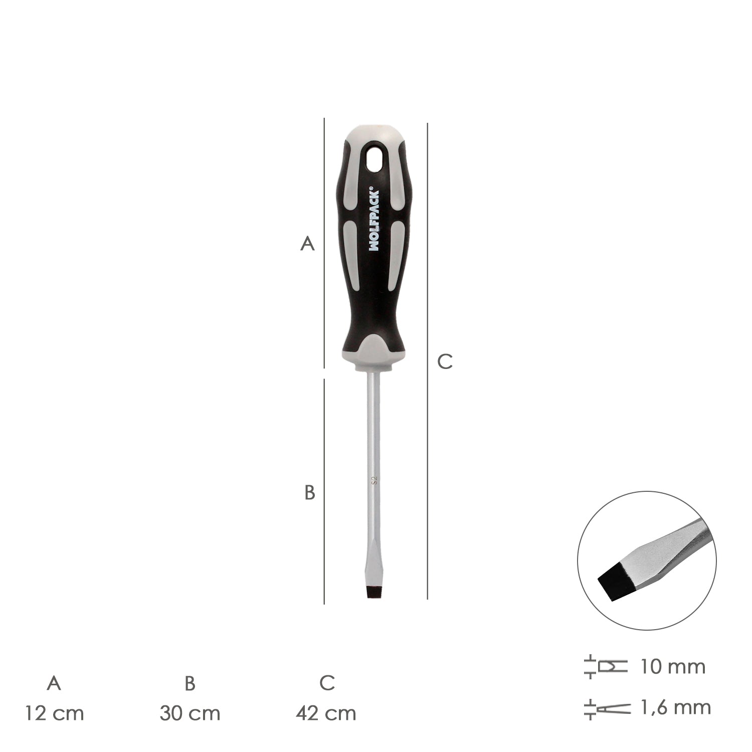 Destornillador Plano Estampado Acero S2 Mango TPR Bimaterial. Medida 1,6 x Ø 9,0 x 300 mm. DIN5265