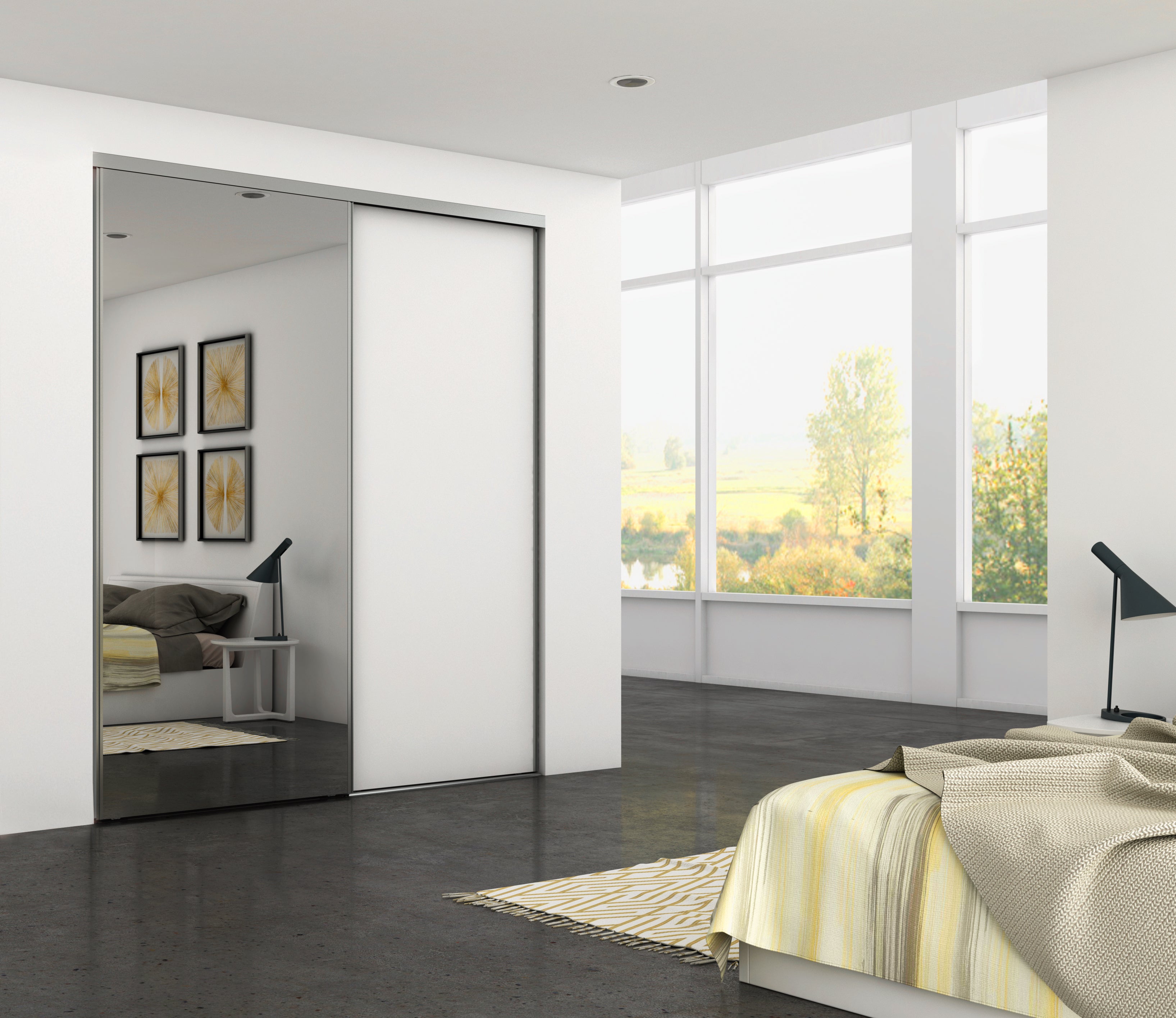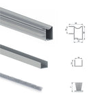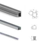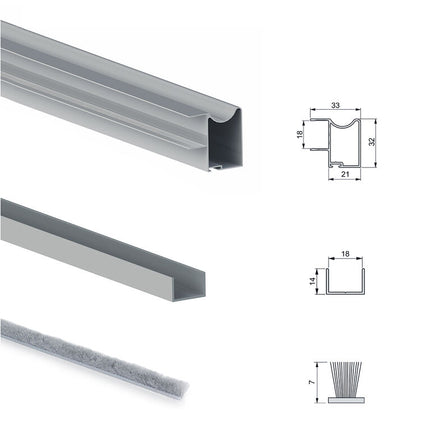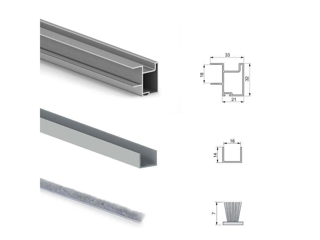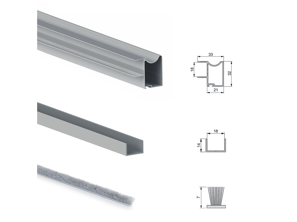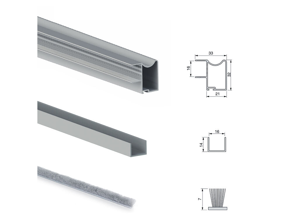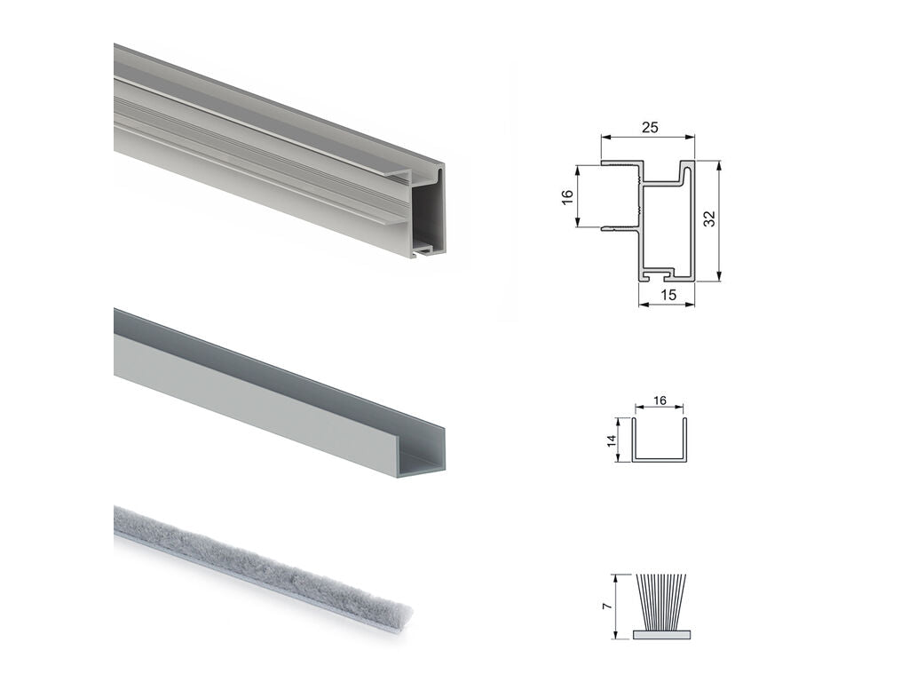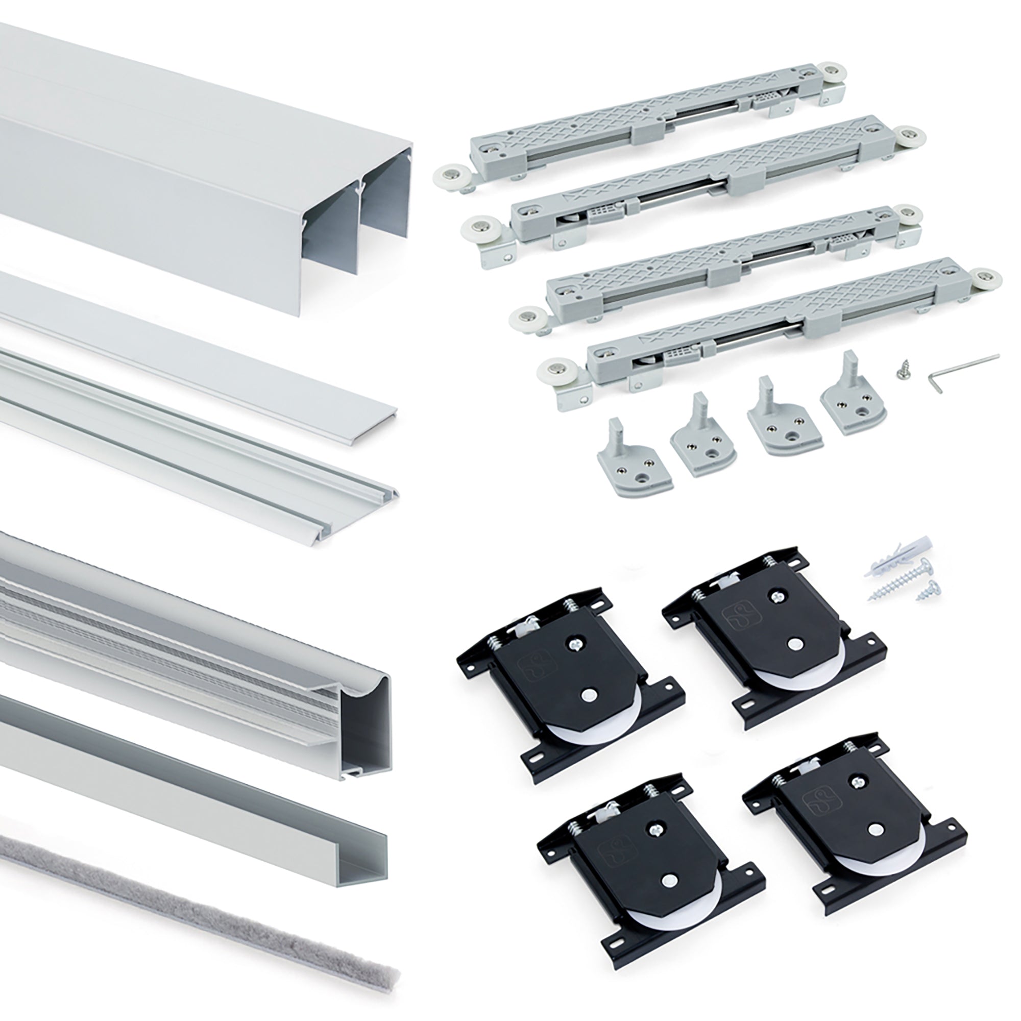 • Espesor 16 mm 1 juego de herrajes para dos puertas, 1 juego de dispositivos para el cierre suave, 1 carril superior de 2.350mm, 1 carril inferior de 2.350mm, 1 tapa de carril inferior de 2.350mm, 4 perfiles tiradores de 2.350mm, 1 perfil travesaño U de 2.300mm, 1