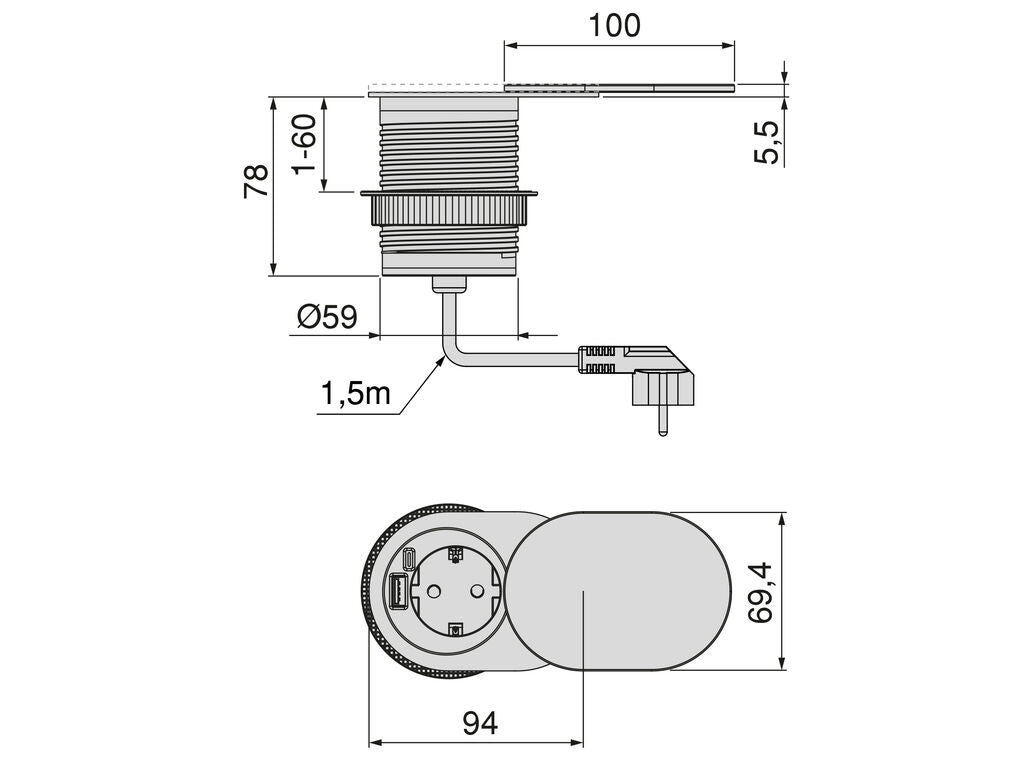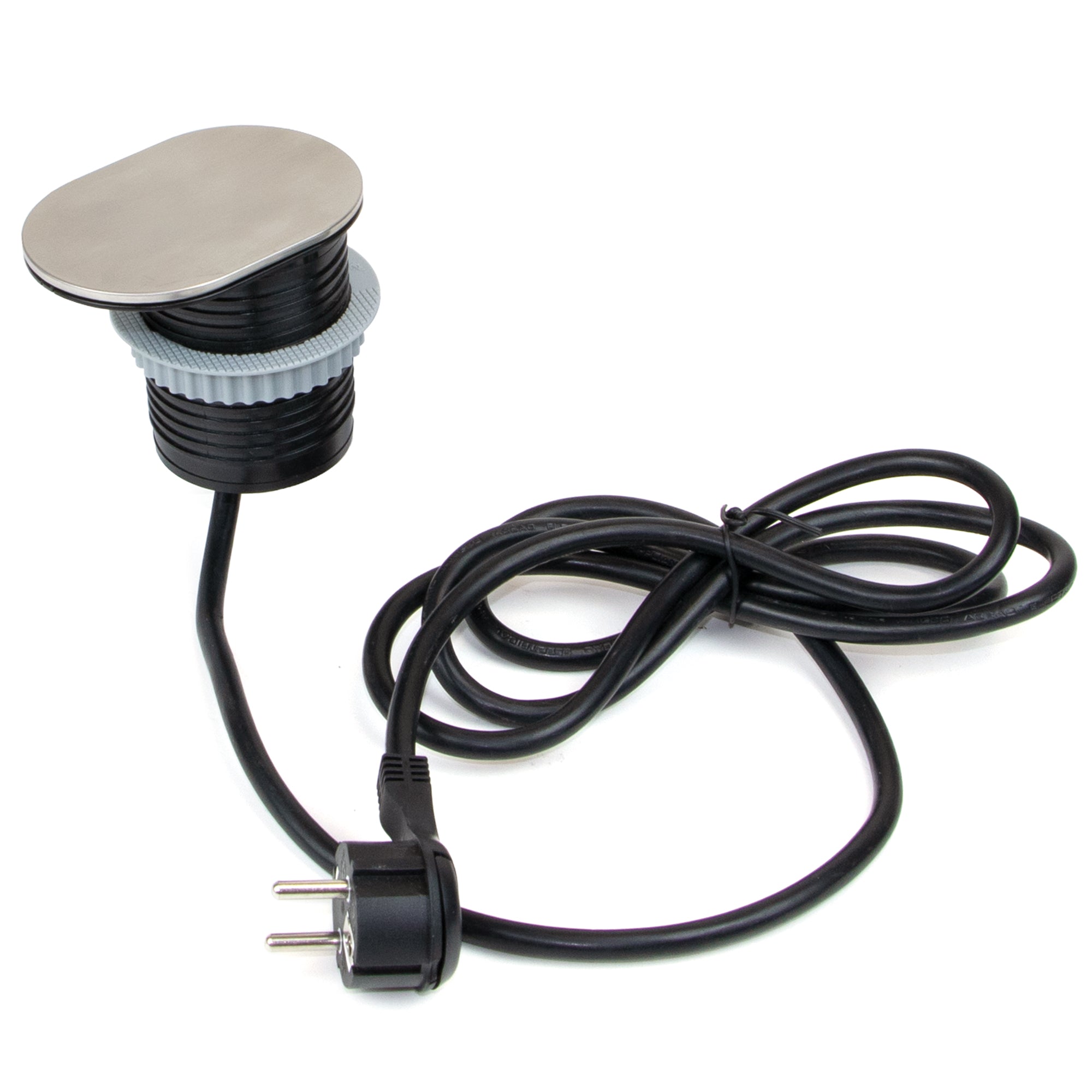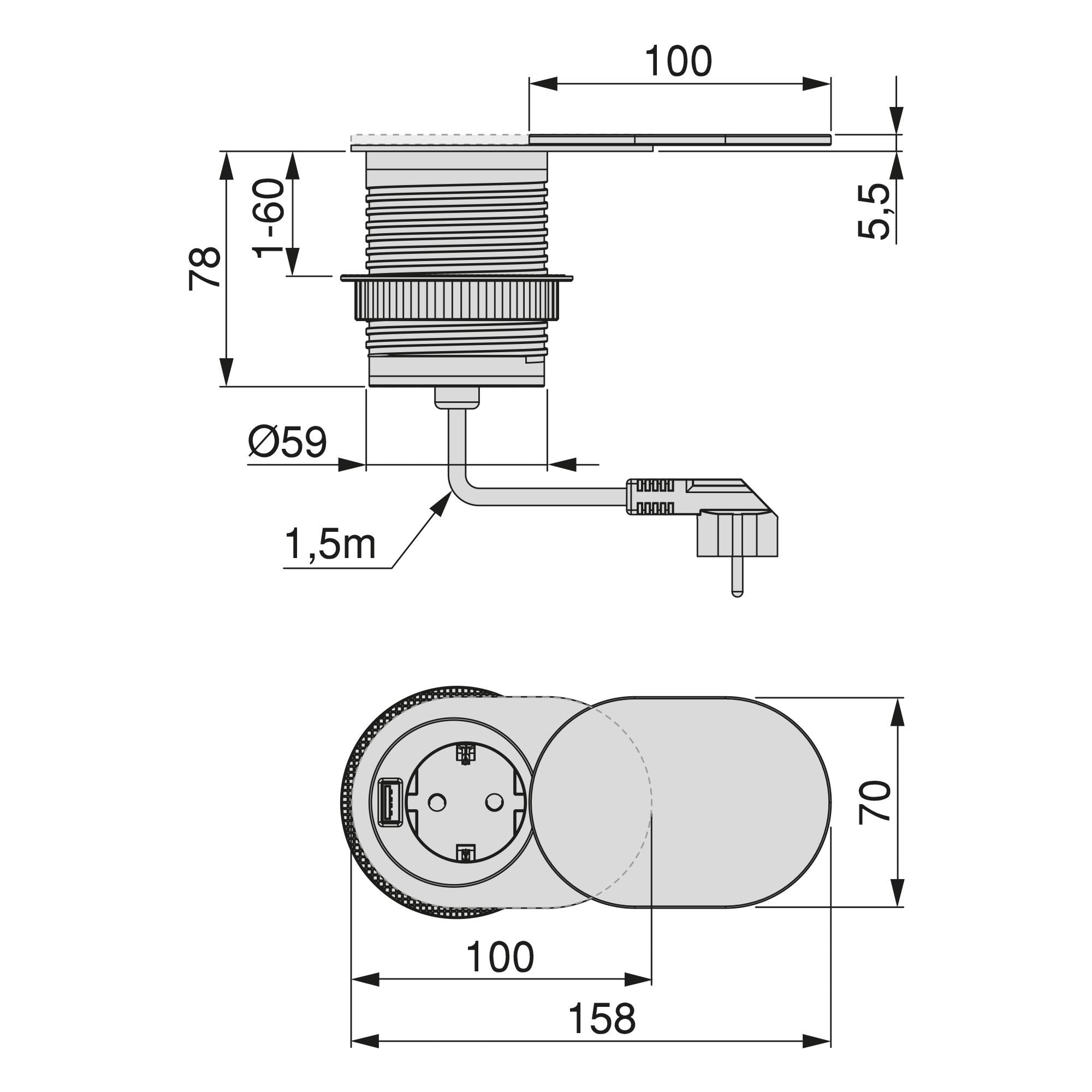 Emuca Multiconector con tapa deslizante Vertikal Flat 60, diámetro 60mm, 1 enchufe Schuko, 1 USB tipo A, Acero inoxidable