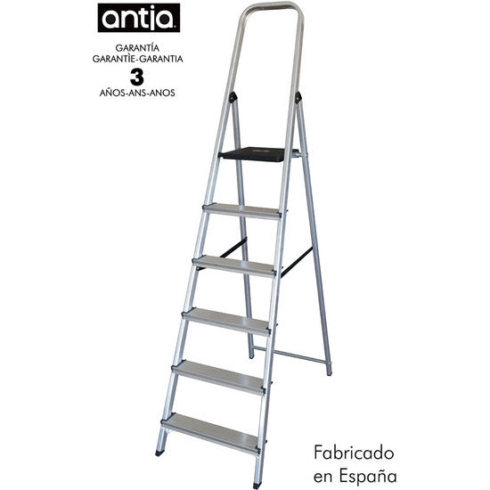 Escalera de 6 peldaños diseñada para ofrecer un acceso cómodo y estable hasta 1,98 m de altura. Pensada para trabajos domésticos, mantenimiento y tareas ligeras en taller, combina facilidad de uso con un perfil compacto que facilita su manipulación y almacenamiento.