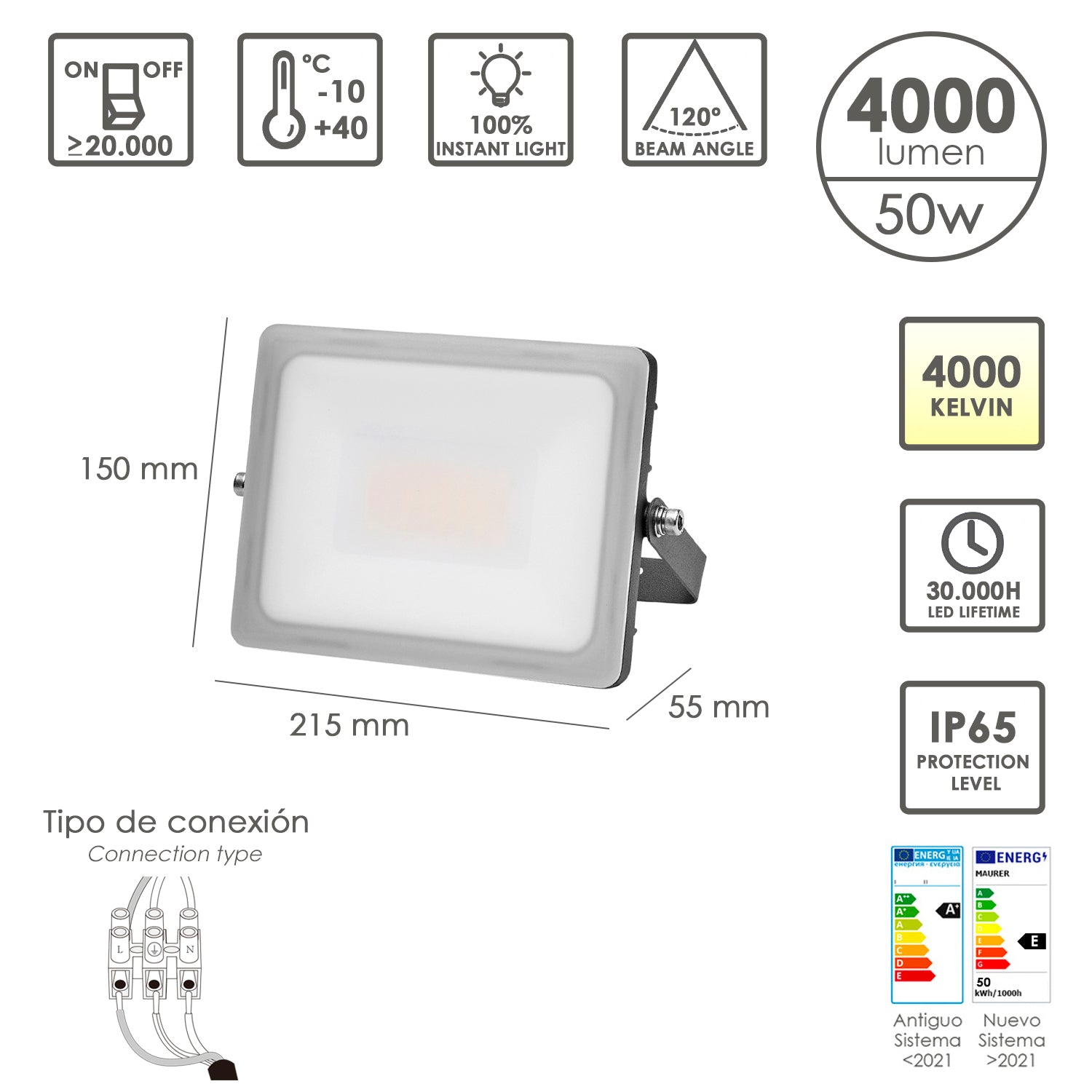 Foco Led Plano Potencia 50 Watt. 4000 Lumenes. Luz blanca 4000ºK Protección IP65. Cuerpo Aluminio. Foco Exteriores / Interiores.