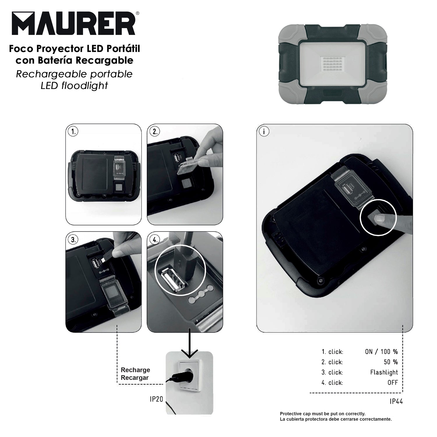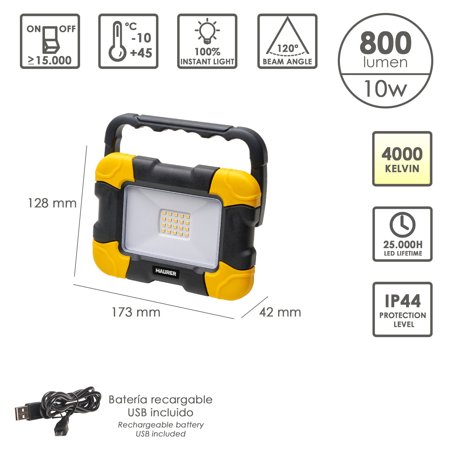 Foco Led Plano Recargable 10 Watt. 800 Lumenes Luz blanca 4000ºK Protección IP44. Portatil Proyector Led Obras