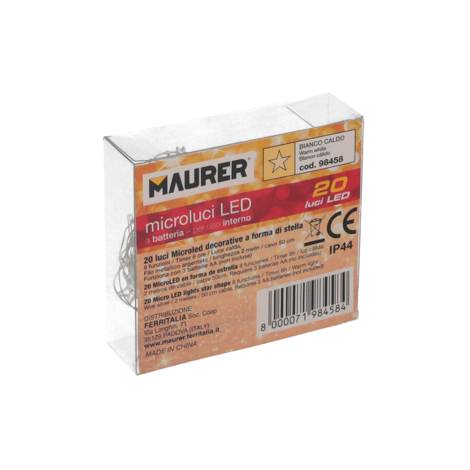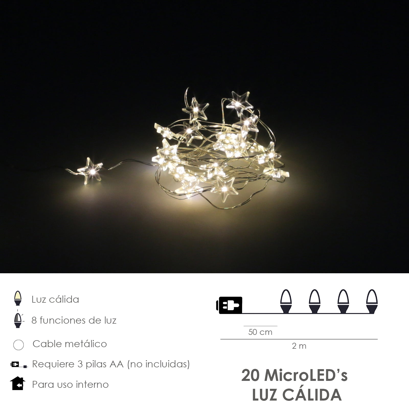 Guirnalda Luces Navidad Estrellas 20 Leds Color Blanco Calido.Luz navidad interiores y exteriores IP44 A Pilas 3AA (No Incluida)