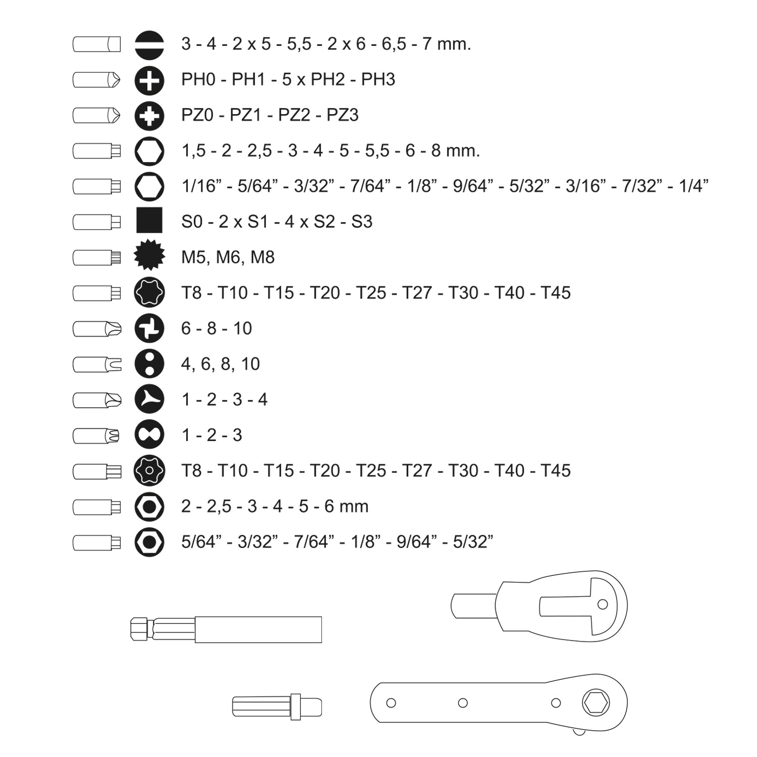 Juego Puntas con Destornillador 1/4" 99 Pzs. Con Apadtador. Cromo Vanadio, Kit Llave Combinada, Kit Carraca,