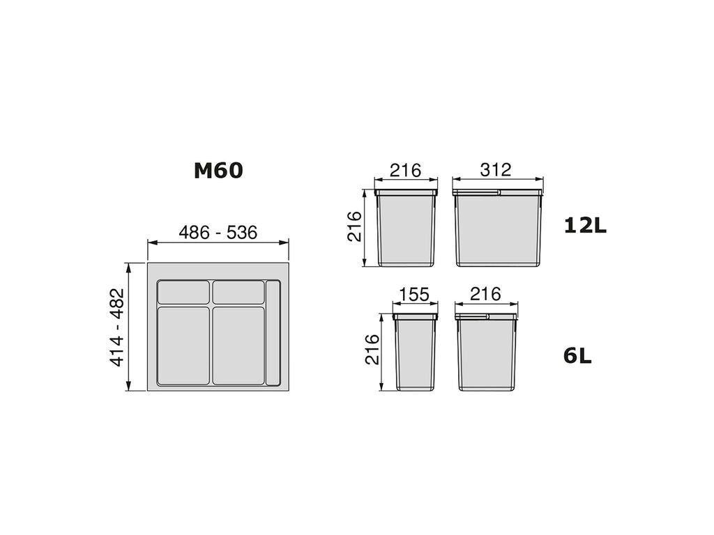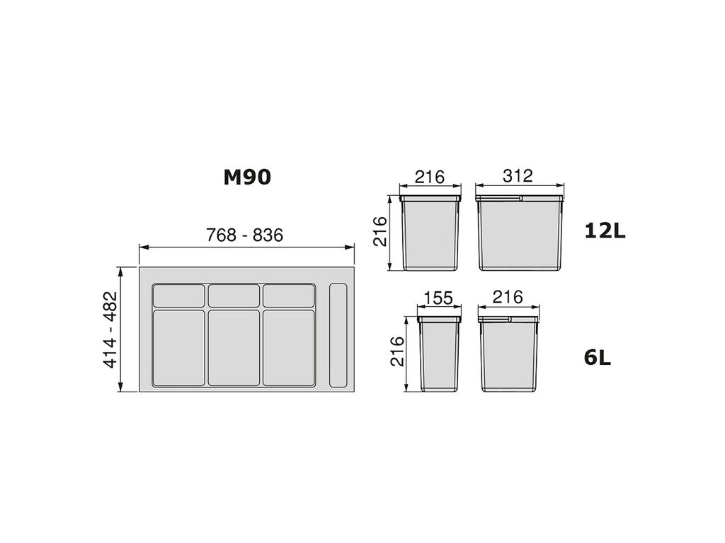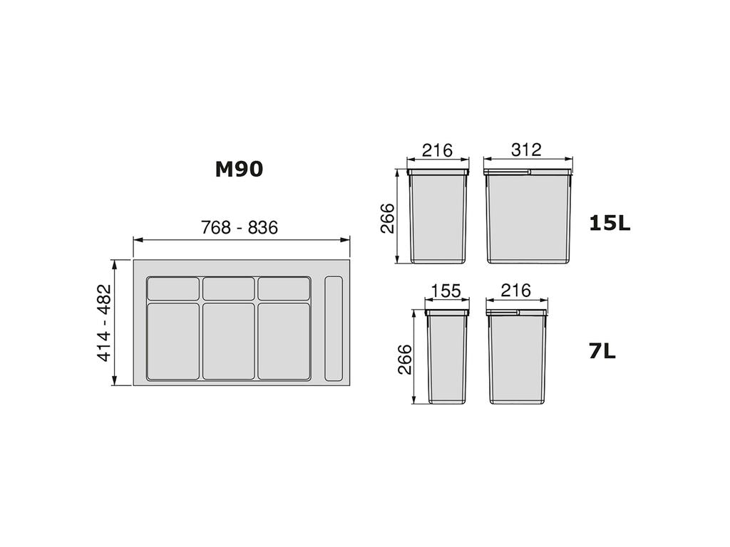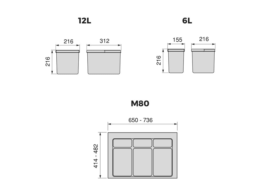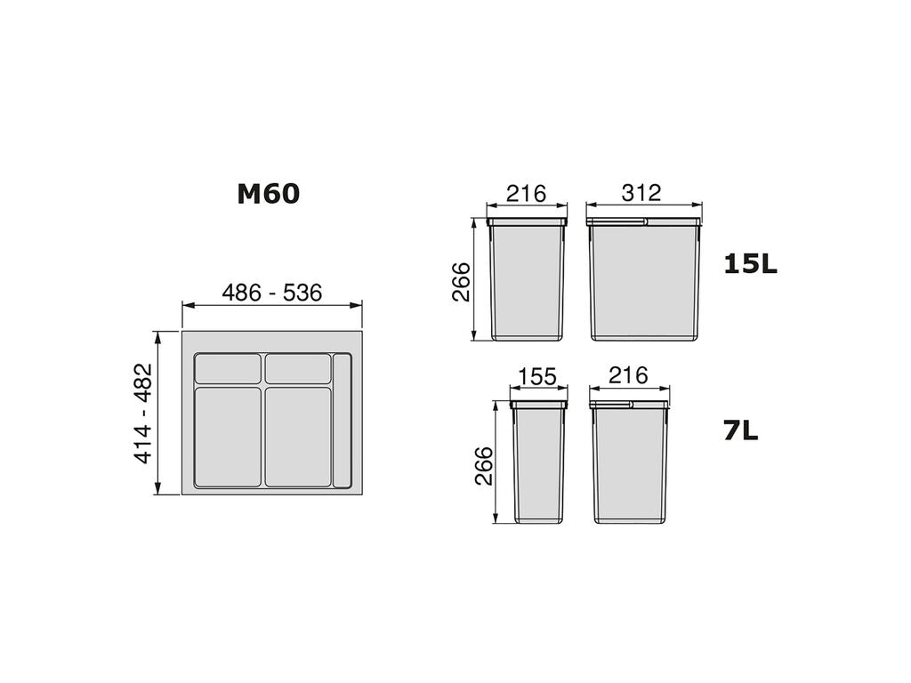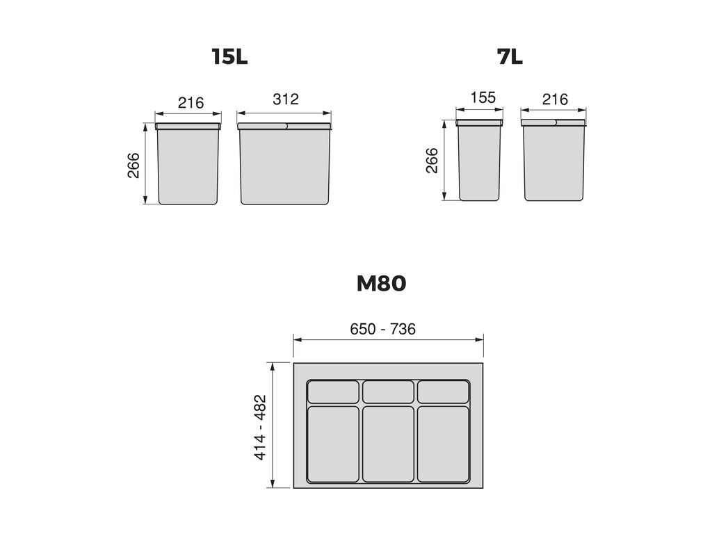 • Altura 216/266mm módulos 600/800/900mm 1 base M80, contenedores 12/15L, contenedores 6/7L