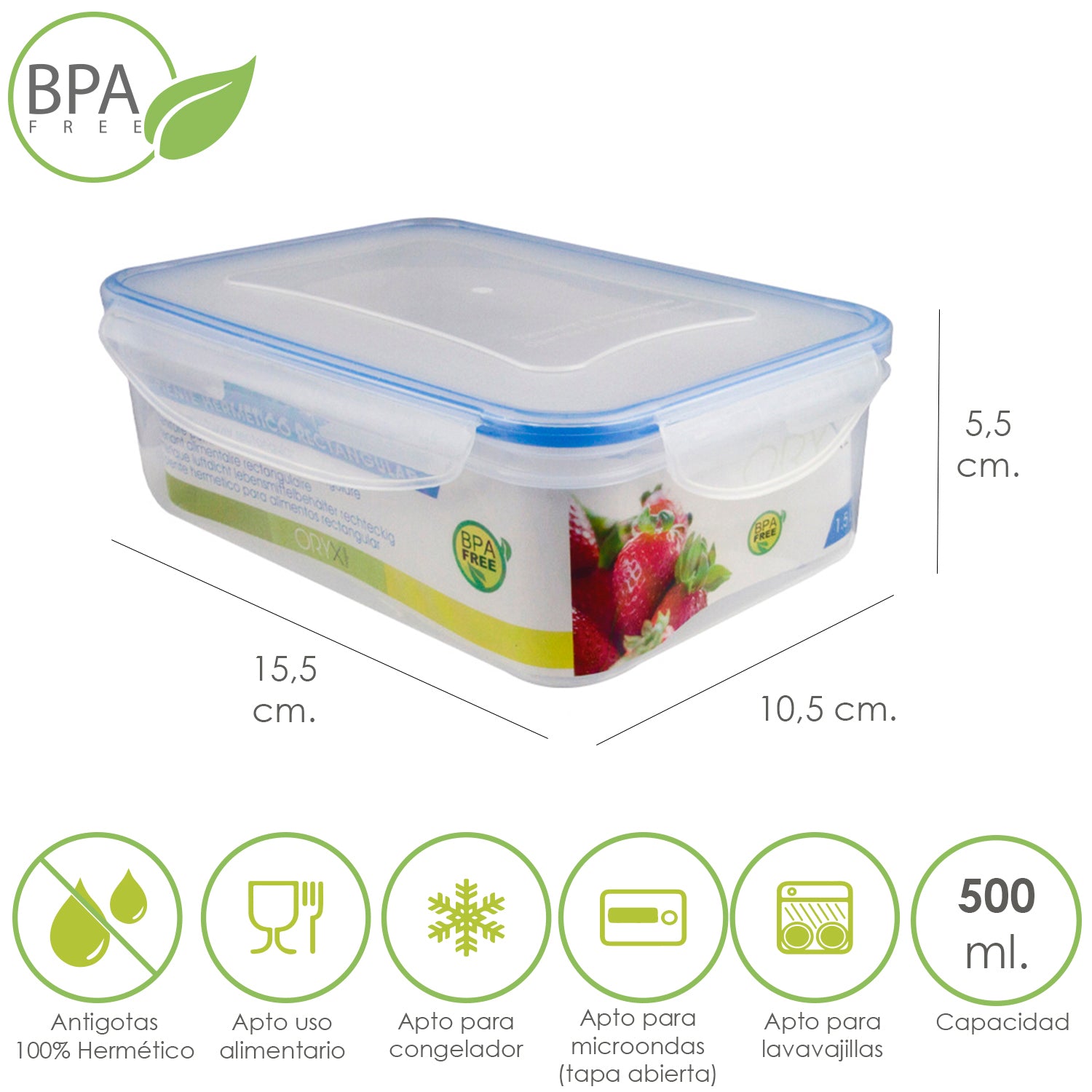 Recipiente Hermetico Plastico Rectangular 500 ml. 15.5x10.5x5.5 (Alt.) cm.