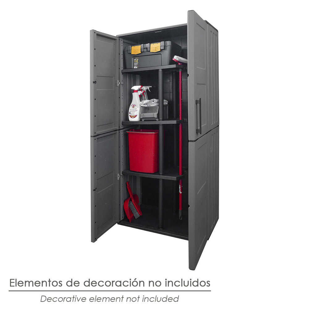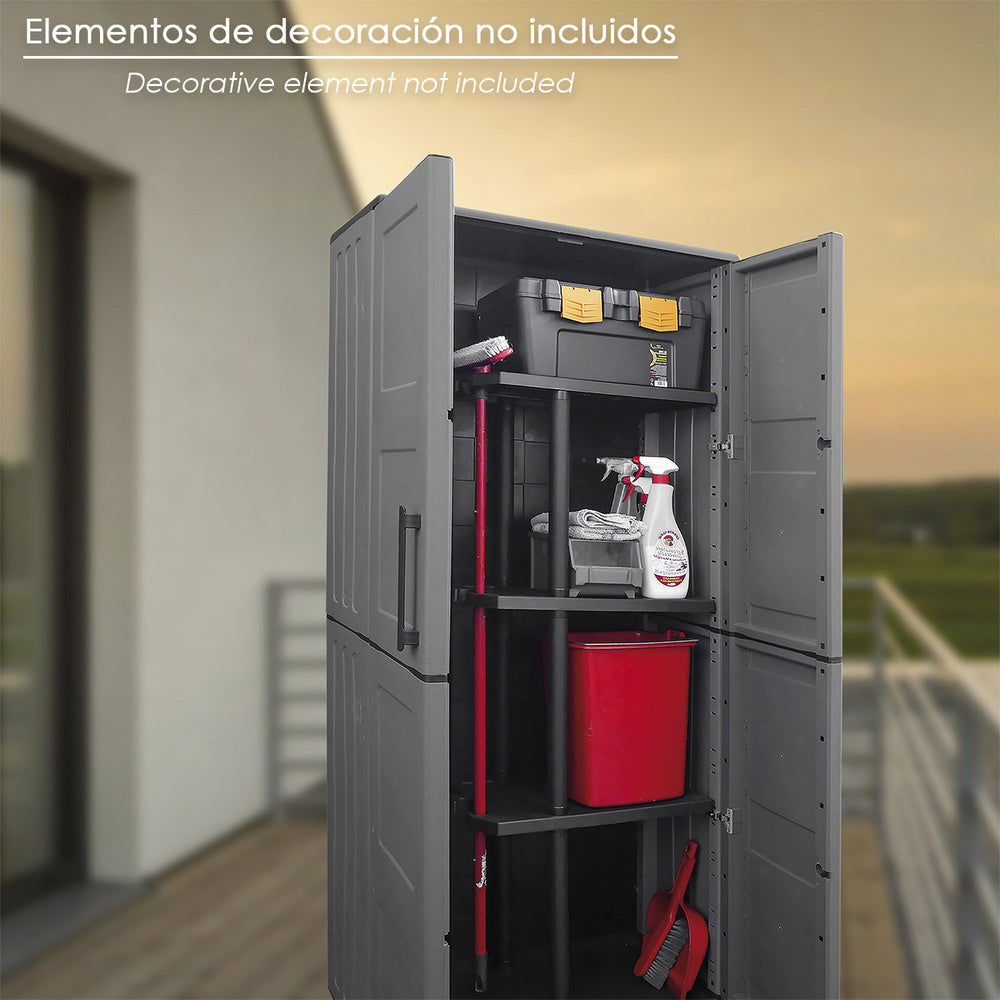 Armario Resina Alto 68x37x163 cm. Con Portaescobas. Color Gris Oscuro. Producto de uso profesional diseñado para trabajos de instalación, mantenimiento y reparación. Armario resina alto con portaescobas. - Práctico y elegante armario de resina de gran altura, perfecto para organizar tus espacios de forma eficiente. - Con unas medidas de 68x37x169 cm, este armario incluye un conveniente portaescobas que te ayudará a mantener tu hogar impecable. - Su moderno color gris oscuro le otorga un toque de sofisticación, mientras que su material de fabricación en resina garantiza durabilidad y resistencia. - Ideal para almacenar productos de limpieza, herramientas, utensilios de cocina, despensa, y mucho más. - Producto también conocido como baldas, bandejas, estanterías, bateas, lejas, estantes, almacenamiento, armario resina, armario, armario limpieza, armario organizador, etc. Apto para entornos exigentes. Recomendado para profesionales, talleres e industria.