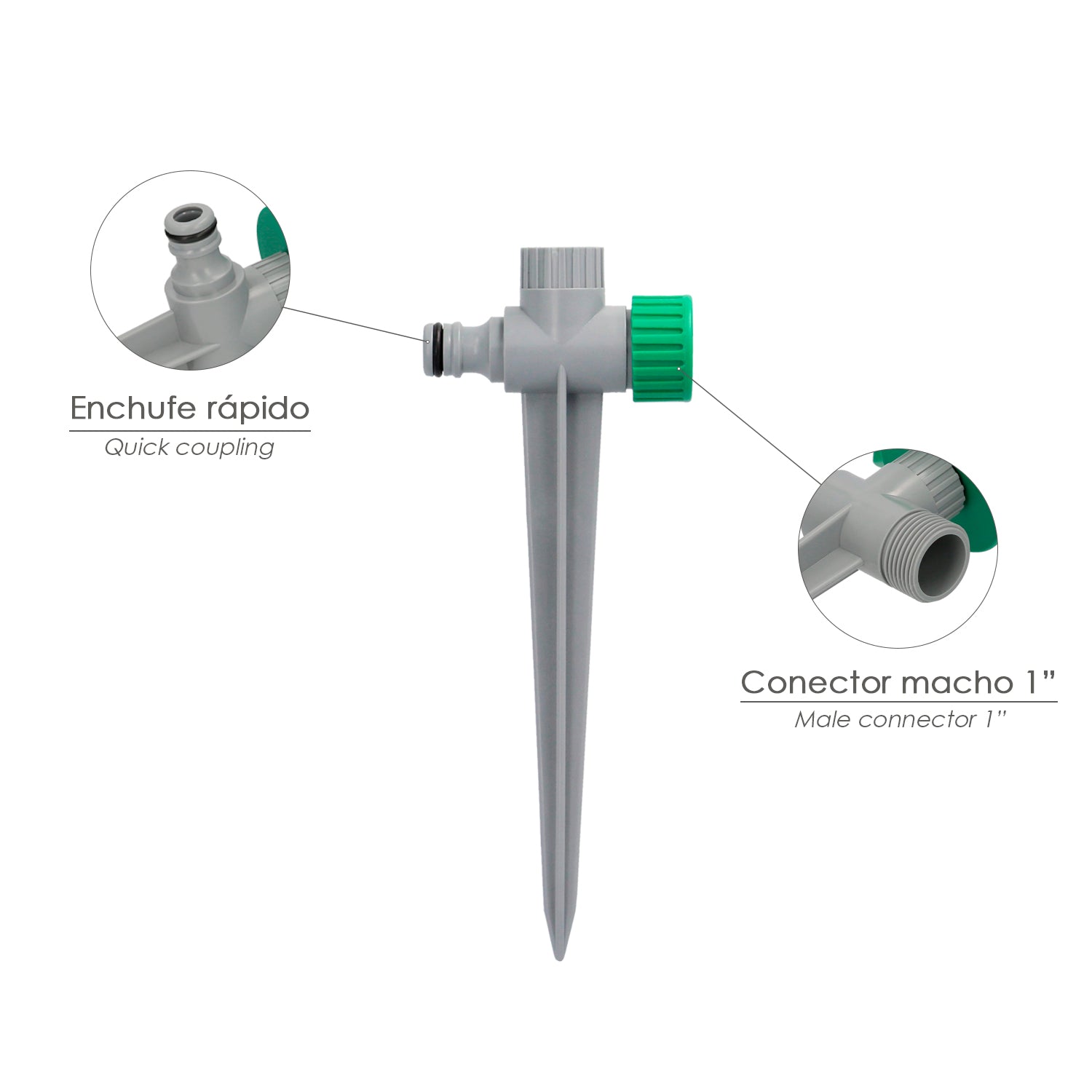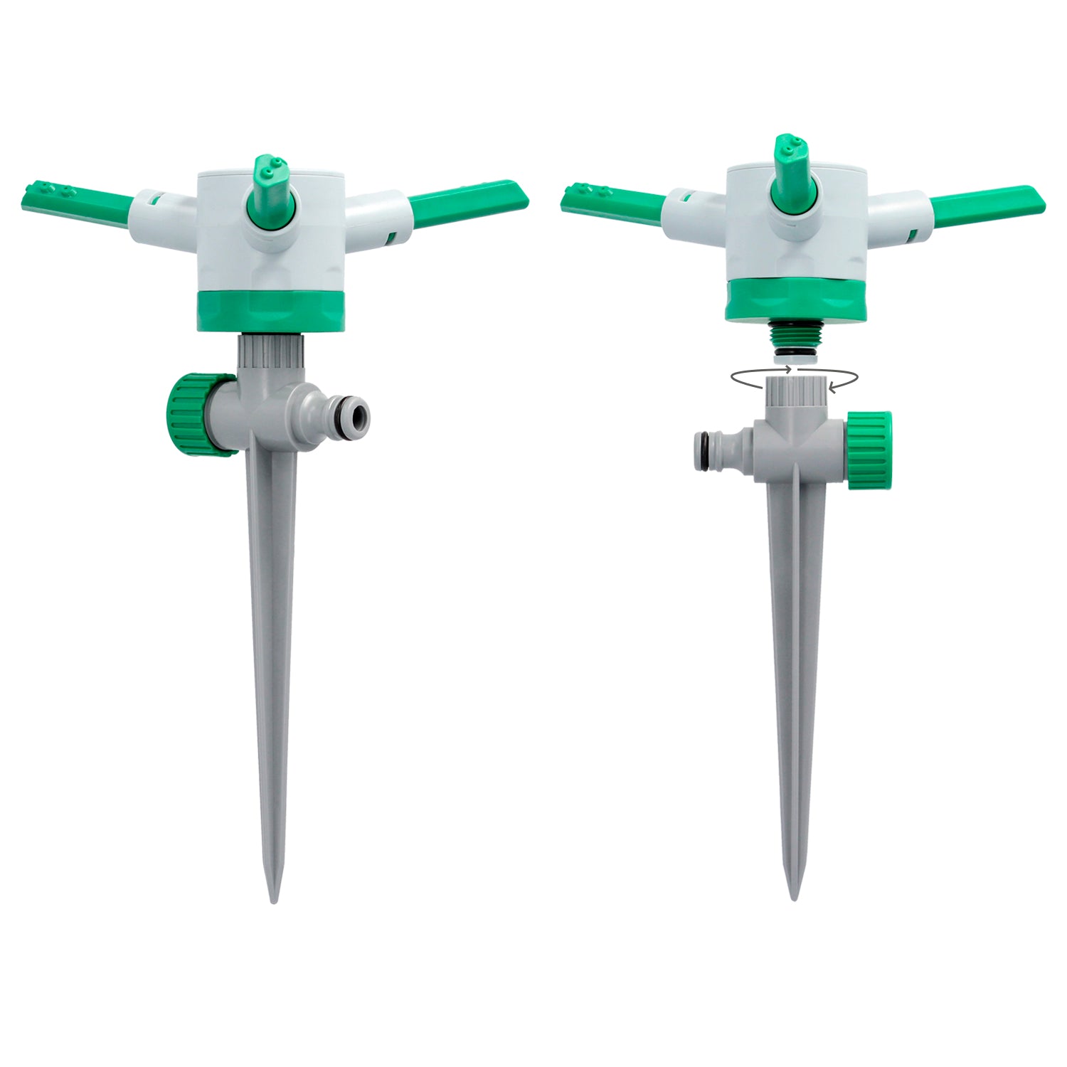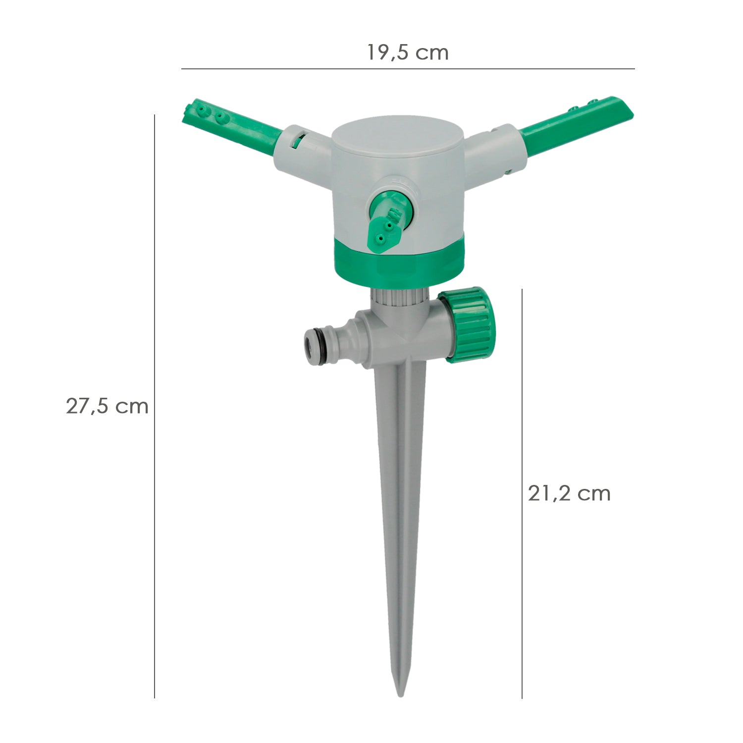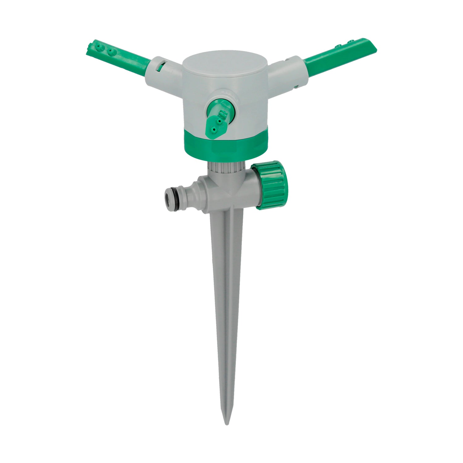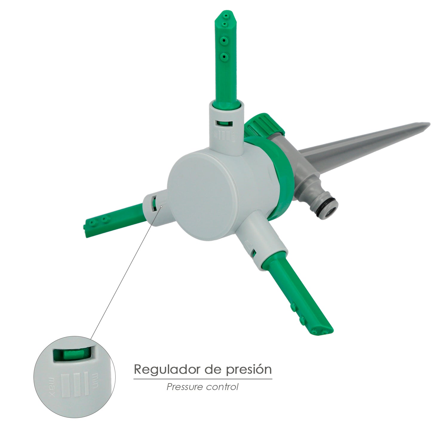 Aspersor de plástico de 3 braços com espigão e regulador de pressão.