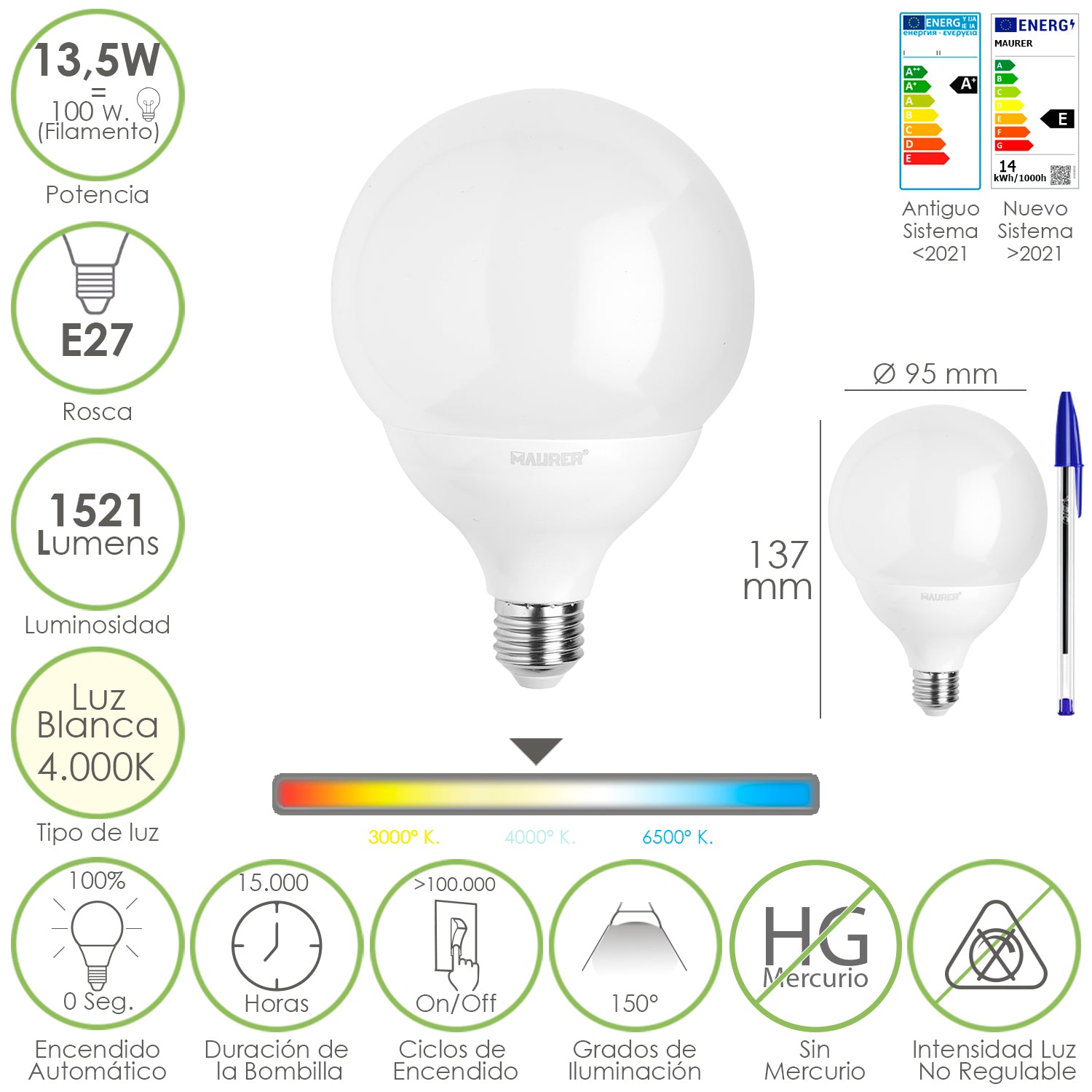 Lâmpada LED E27 Globo Esférico. 13,5 Watts. Equivalente a 100 Watts. 1521 Lúmens. Luz Neutra 4000º K.