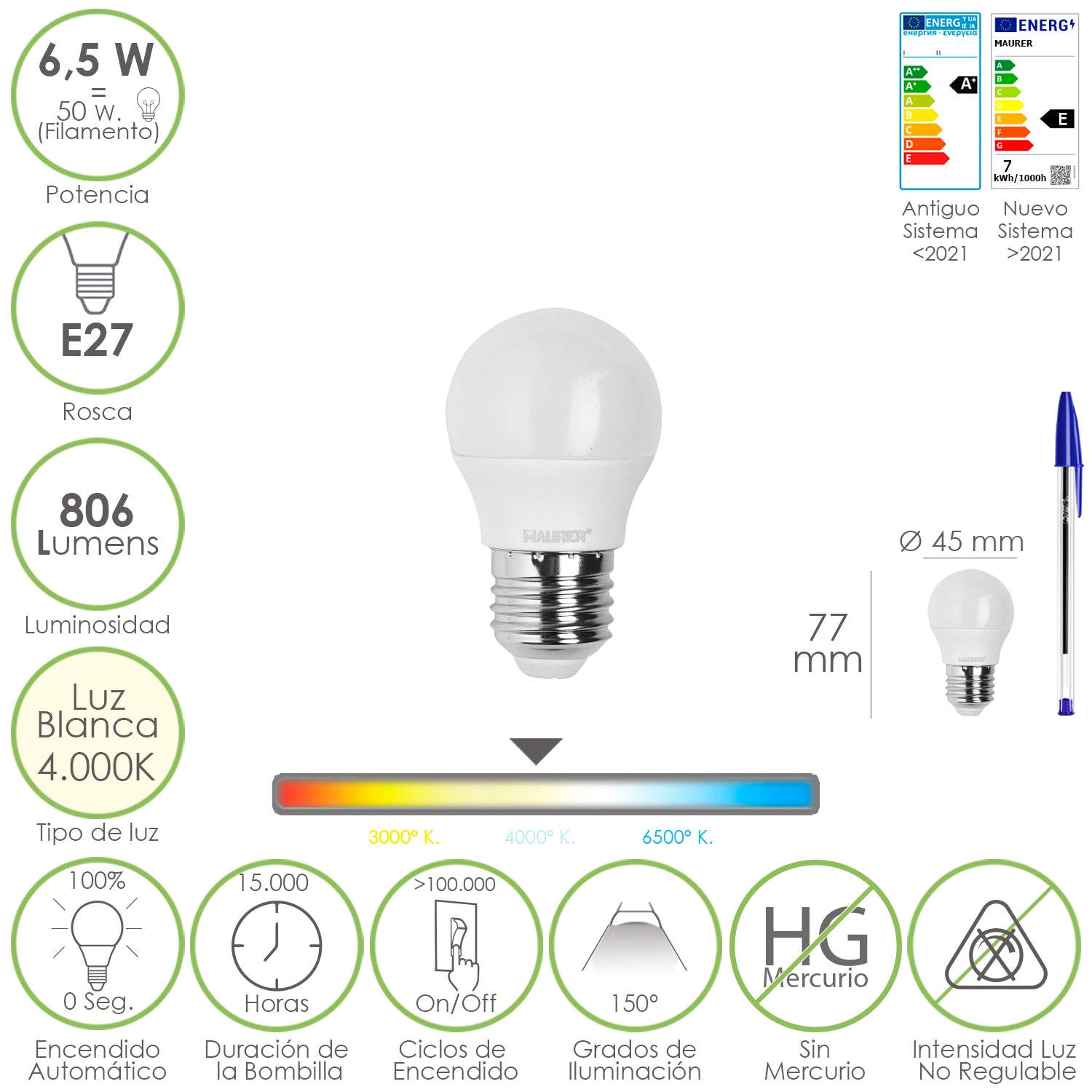 Lâmpada esférica LED E27. 6,5 Watts. Equivalente a 50 Watts. 806 lúmens. Luz neutra, 4000K.