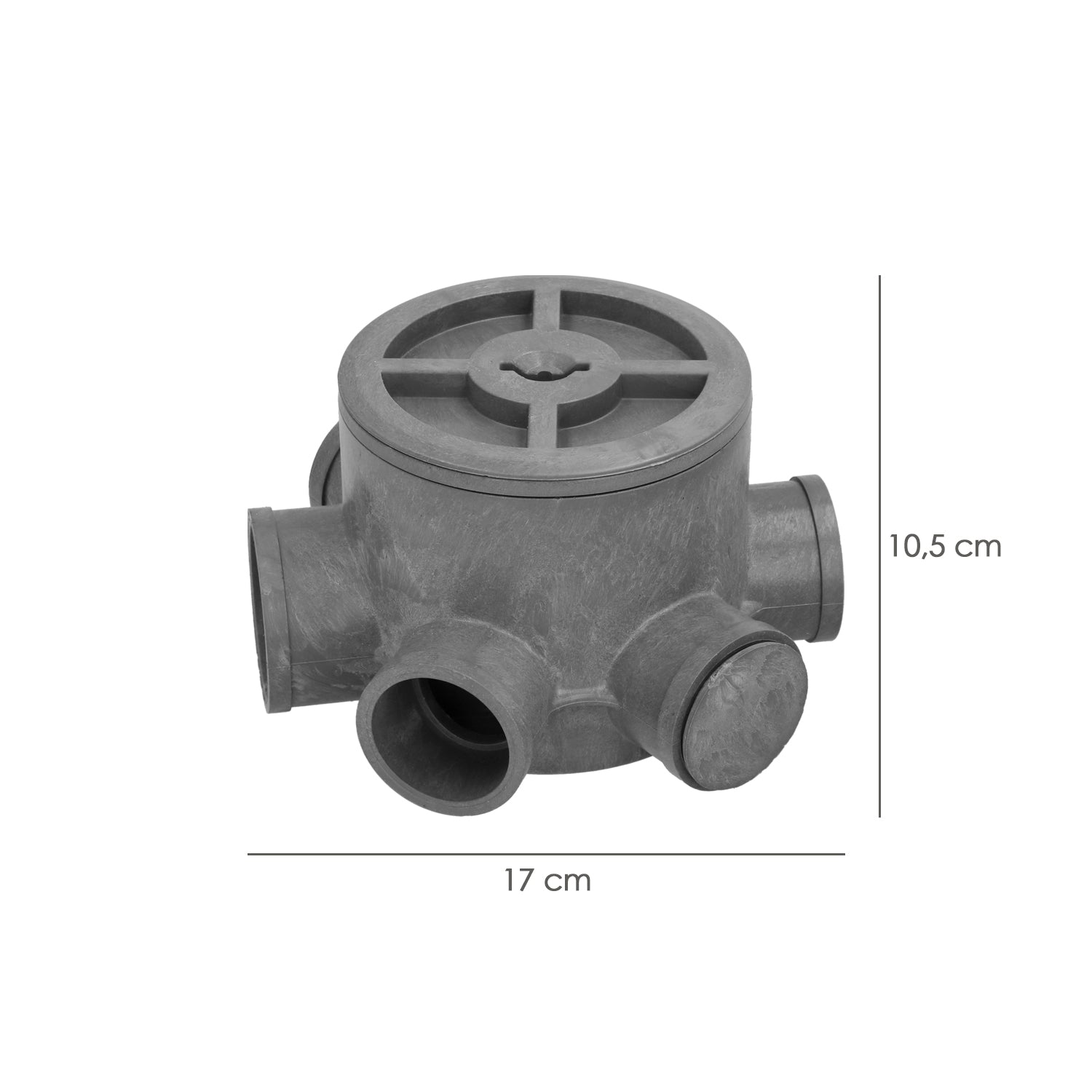 Tanque sifão de PVC com tubos de Ø 110 mm. Saídas de Ø 50 e 40 mm. Altura 105 mm.